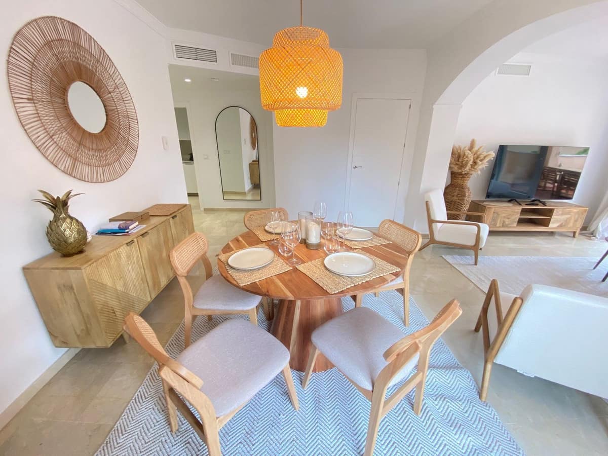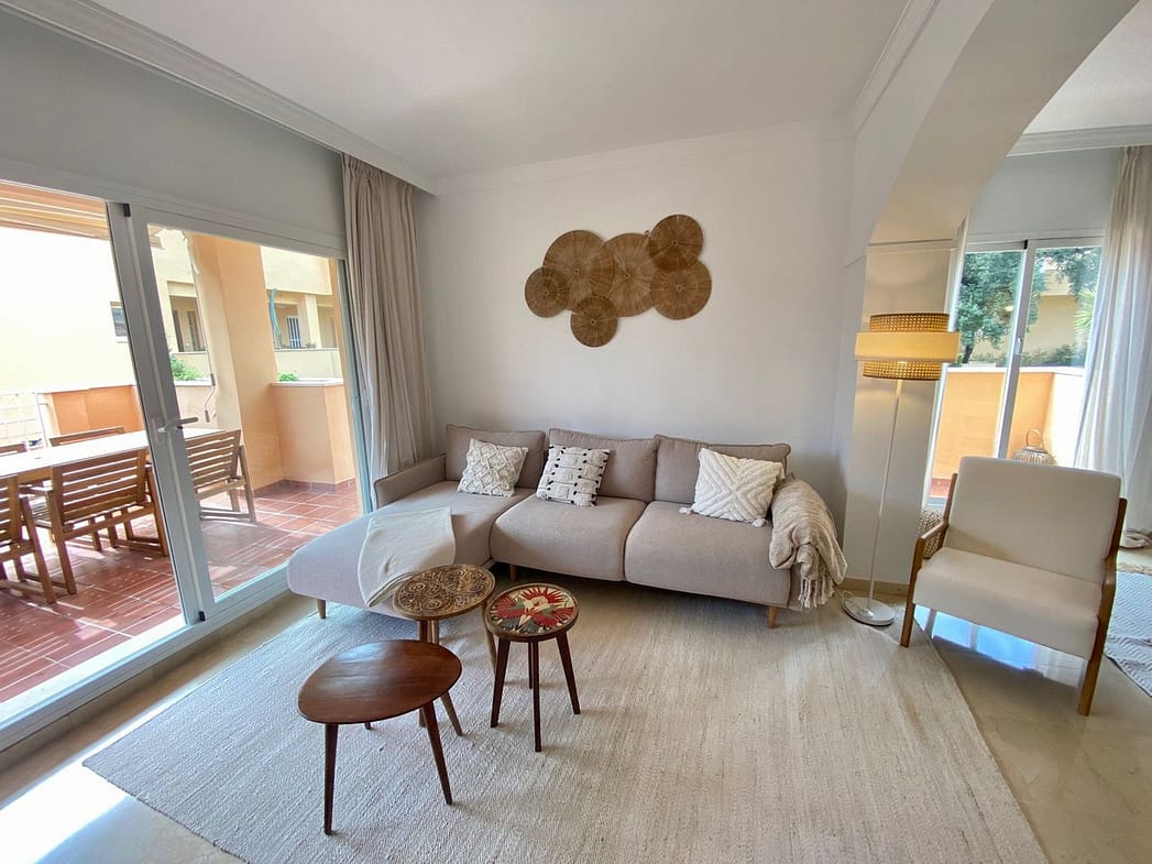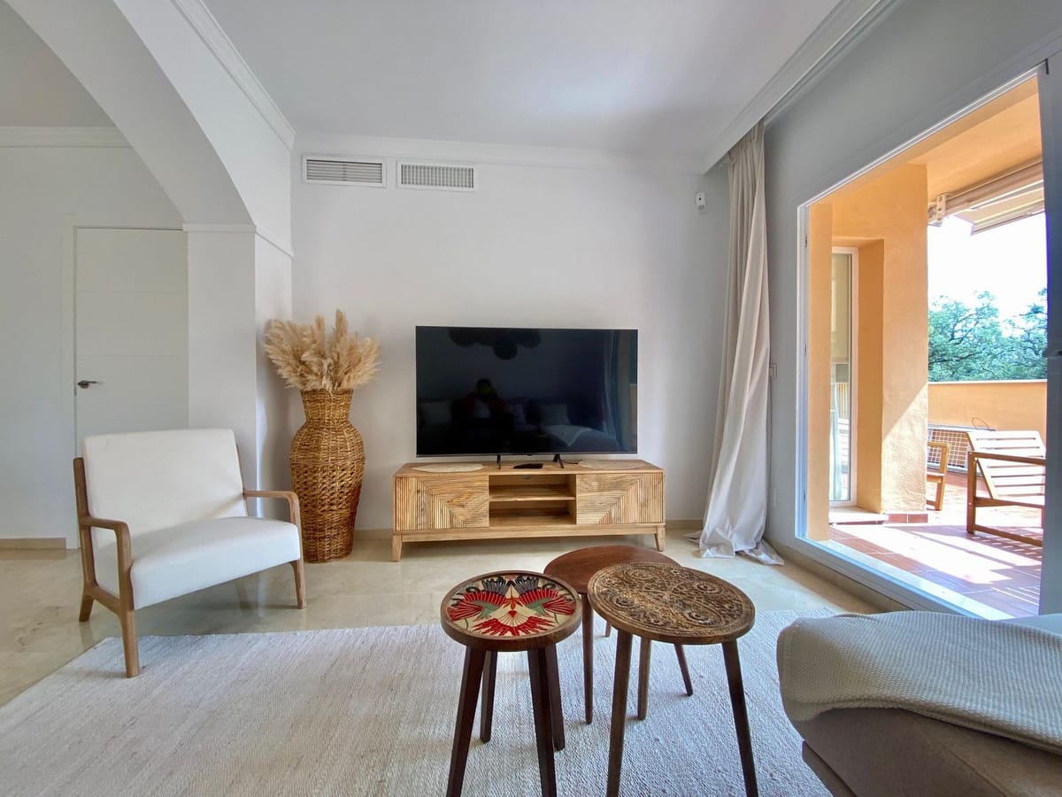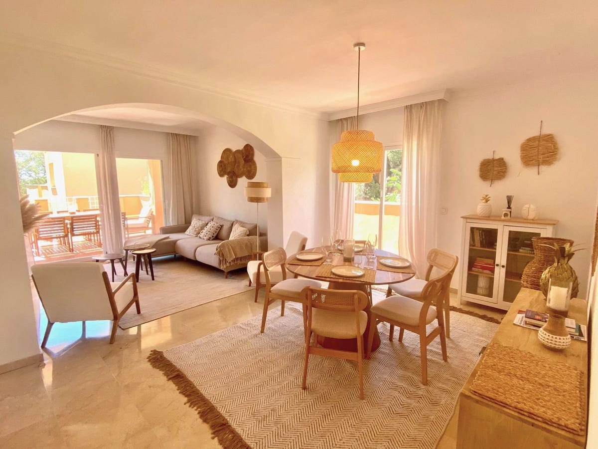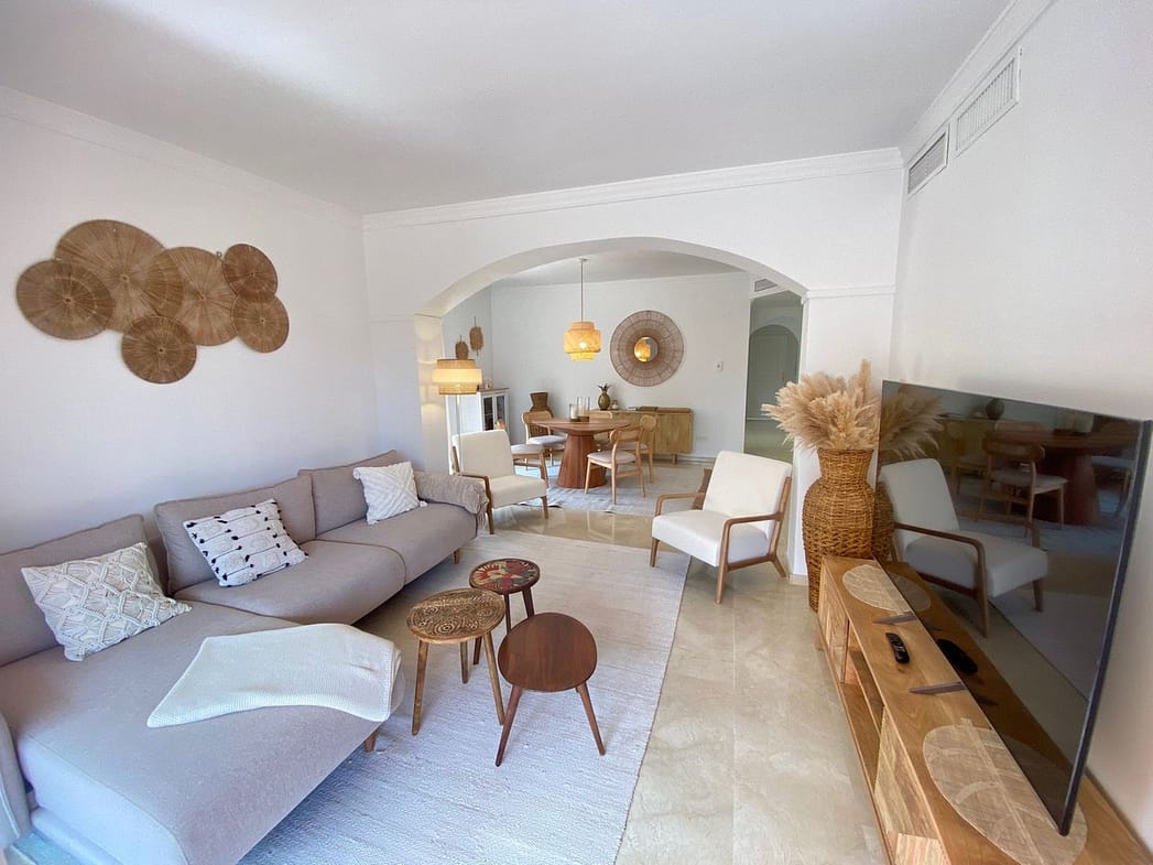 Enjoy a first-class stay at this beautifully appointed apartment located in the sought-after Jardines de Santa Maria Golf complex in Marbella East, only a few minutes away from the golden and sandy beaches of Elviria. Perfect for families or groups, this spacious corner unit features three generously sized bedrooms and two modern bathrooms, including a master suite with a Jacuzzi bathtub and direct access to a large south-facing terrace.Step inside and enjoy a newly designed interior, tastefully decorated in boho style with a contemporary touch, creating a space that feels both stylish and soothing. The atmosphere encourages you to feel free and truly relax.