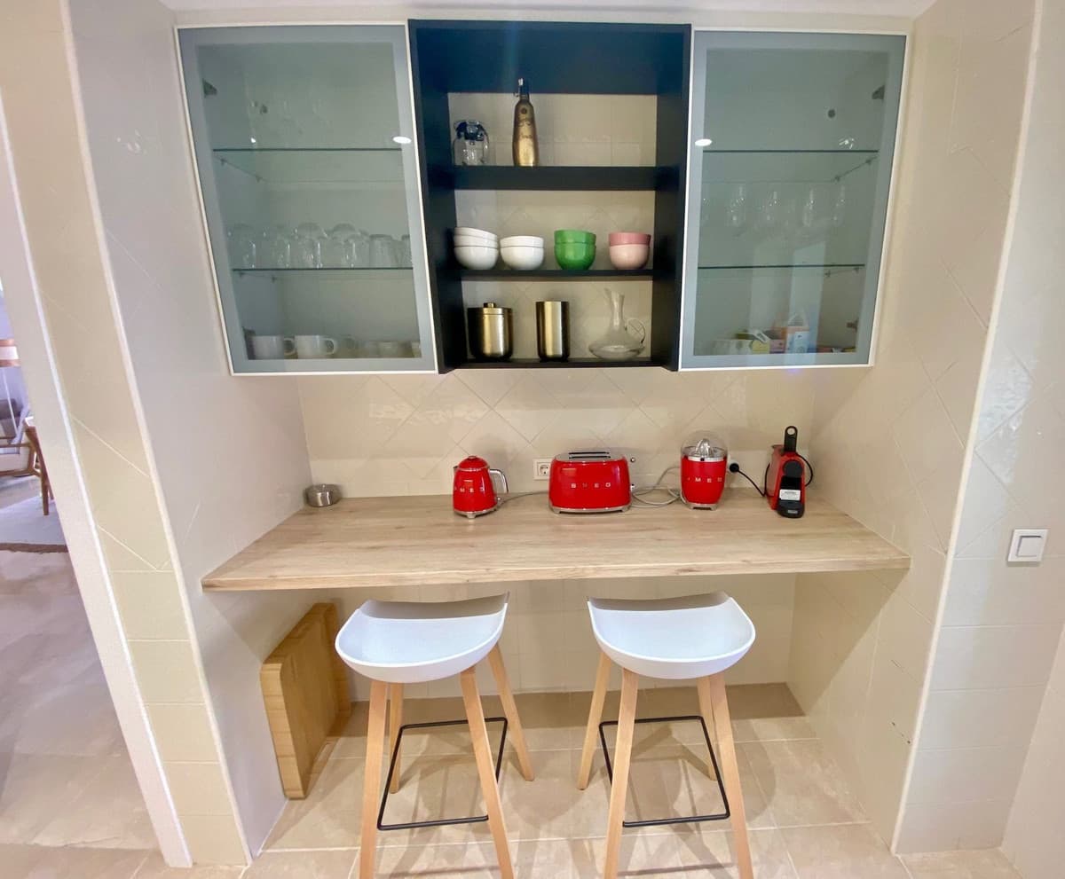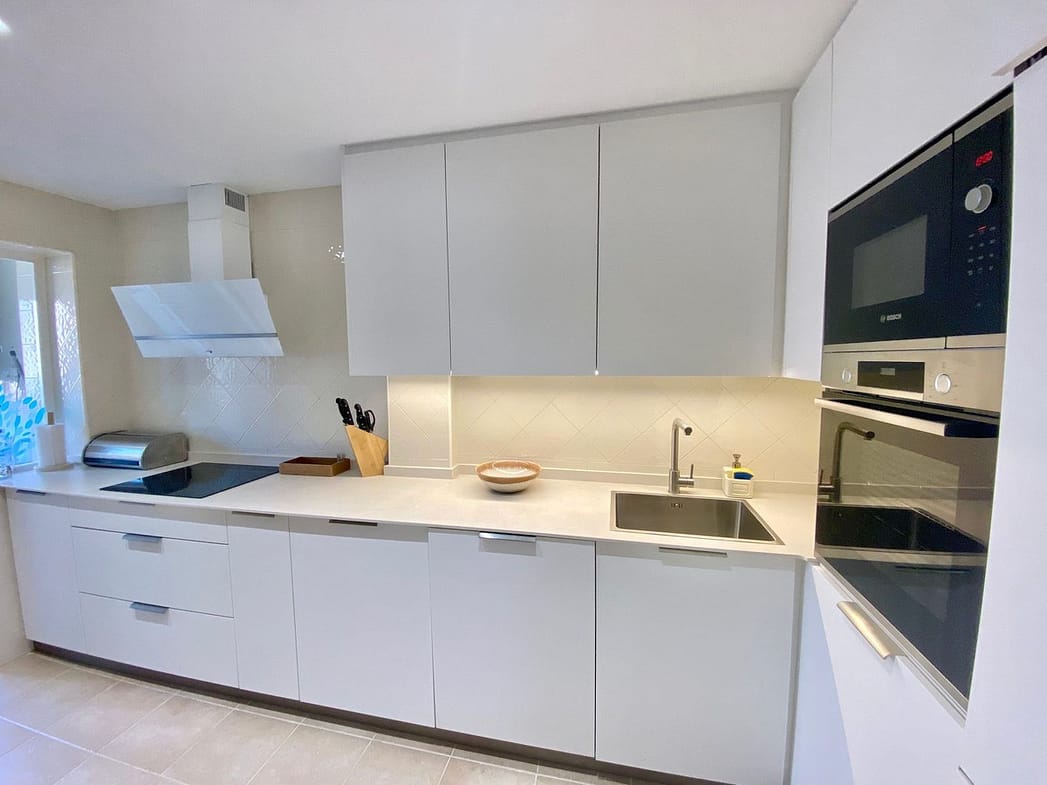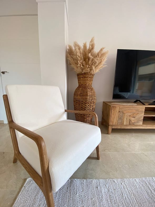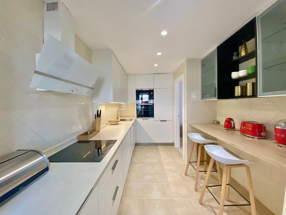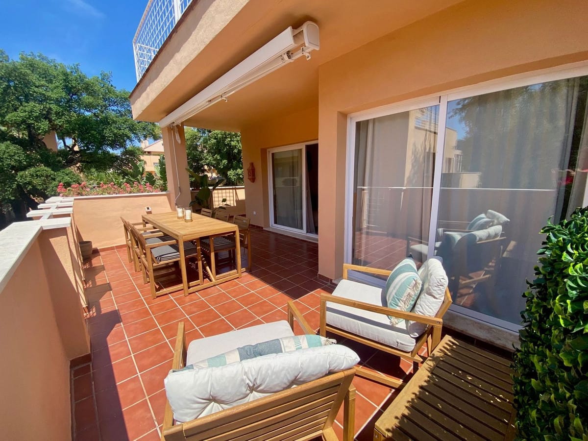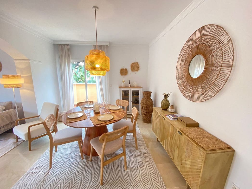 Enjoy a first-class stay at this beautifully appointed apartment located in the sought-after Jardines de Santa Maria Golf complex in Marbella East, only a few minutes away from the golden and sandy beaches of Elviria. Perfect for families or groups, this spacious corner unit features three generously sized bedrooms and two modern bathrooms, including a master suite with a Jacuzzi bathtub and direct access to a large south-facing terrace.Step inside and enjoy a newly designed interior, tastefully decorated in boho style with a contemporary touch, creating a space that feels both stylish and soothing. The atmosphere encourages you to feel free and truly relax.