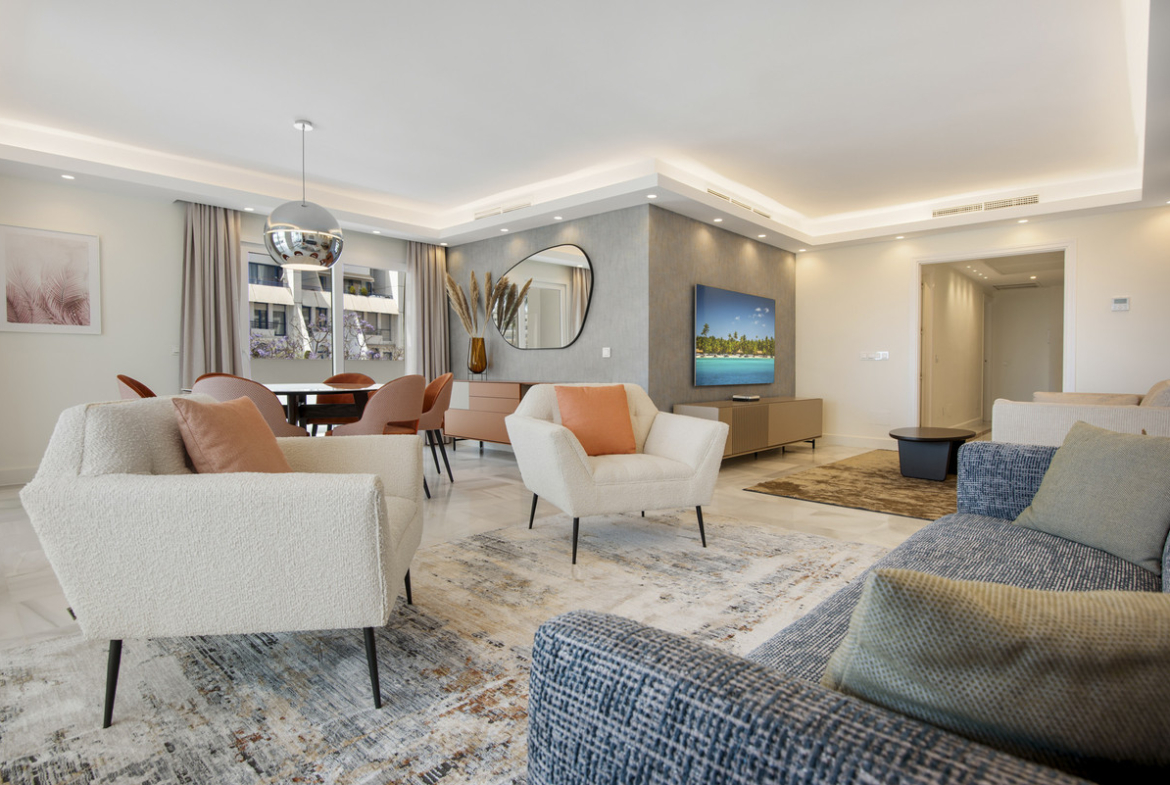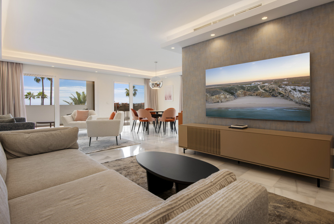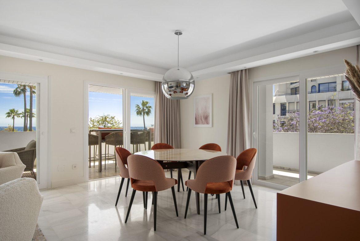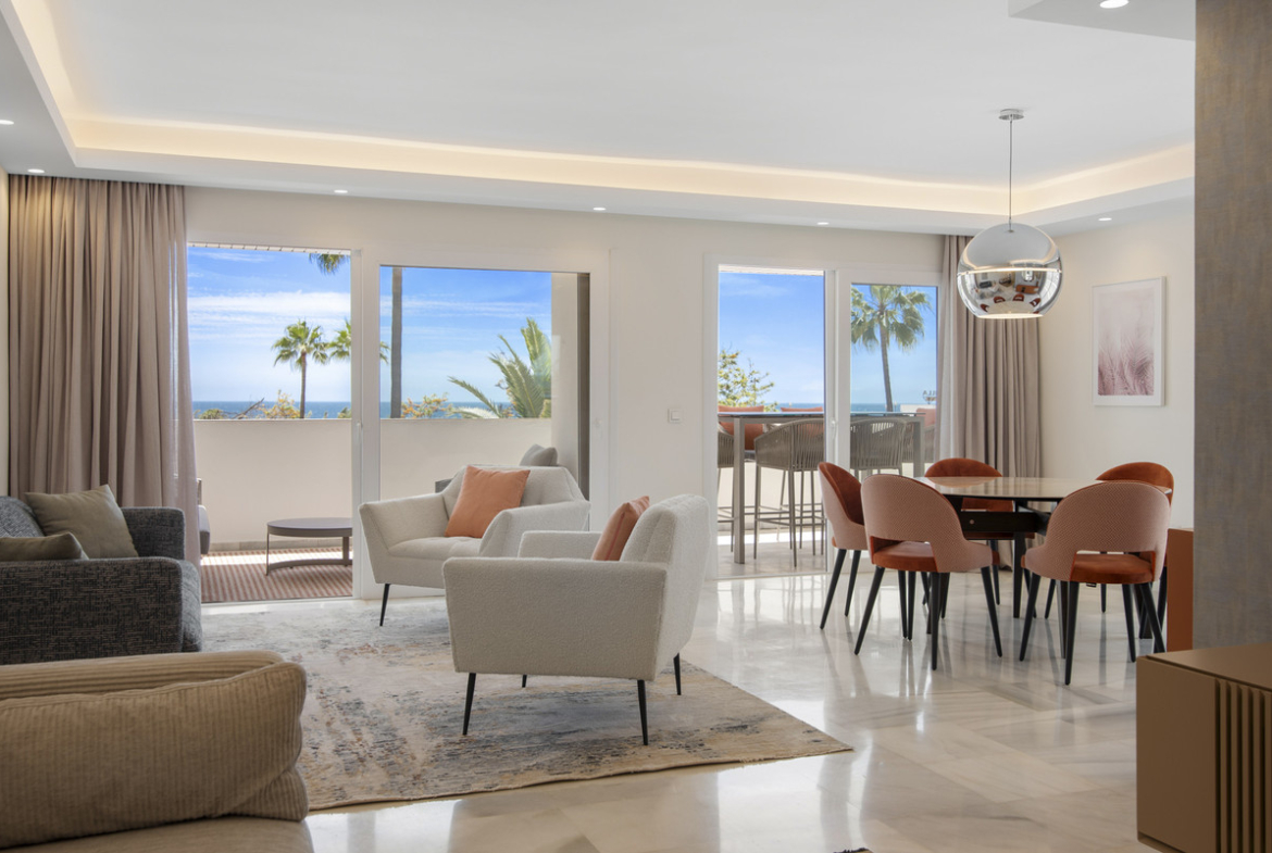 This exquisite luxury apartment is situated in the sought-after location of Playa de la Fontanilla, Marbella, within the beautiful province of Malaga. Spanning a generous 264m², with an impressive interior of 130m² and an expansive private terrace measuring 134m², this property is designed for both comfort and style. The apartment features three well-appointed bedrooms, including one en-suite bathroom, and a total of two elegantly designed bathrooms, catering to both family and guest requirements. Surrounded by stunning panoramic views, the apartment is an ideal coastal retreat, situated just a stone's throw from the beach.
