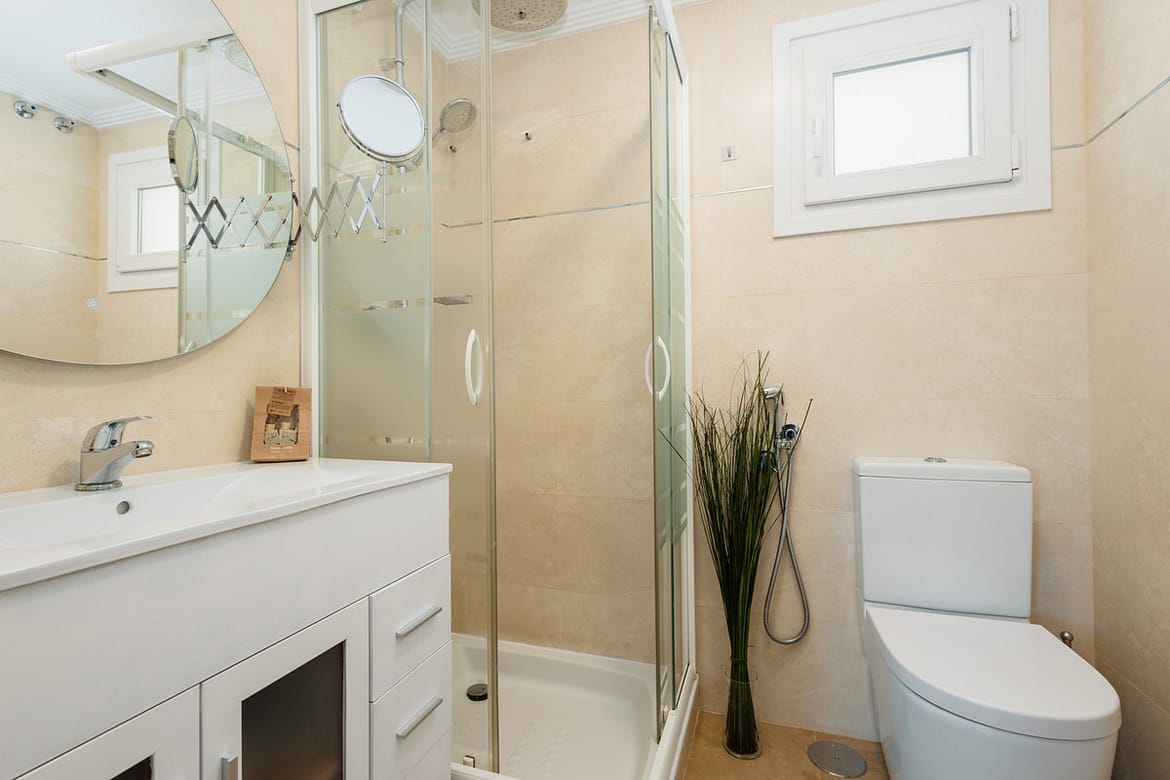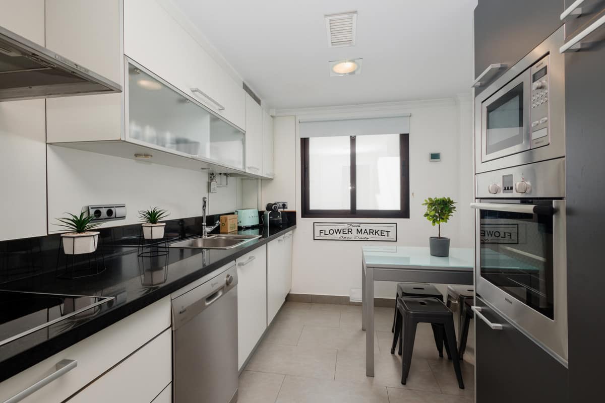 This thoughtfully designed holiday rental Marbella region features a bright living-dining area with comfortable seating for six, smart TV, and abundant natural light. The fully equipped kitchen includes modern appliances – oven, microwave, ceramic hob, coffee maker, toaster, and kettle – plus a convenient utility room with washer and dryer.