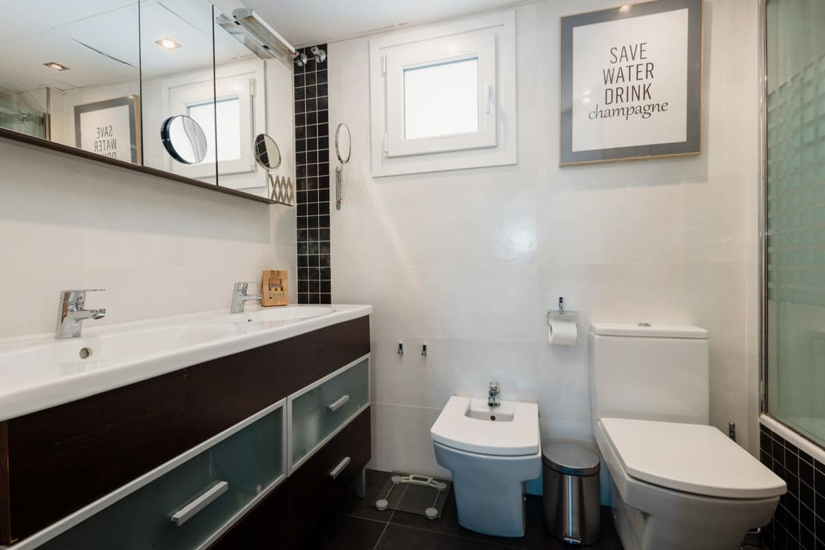 The master bedroom boasts a double bed, en-suite bathroom, and dressing room for ultimate privacy and comfort. The second bedroom features a versatile trundle bed converting to two singles, while the third bedroom offers a double bed, desk, and full-length mirror. Both bathrooms come fully equipped with bathtub, sink, and bidet. Every room includes air conditioning and heating, with Wi-Fi, linens, and towels provided.