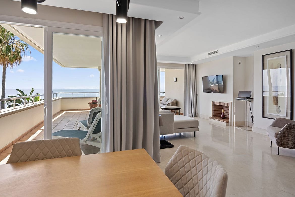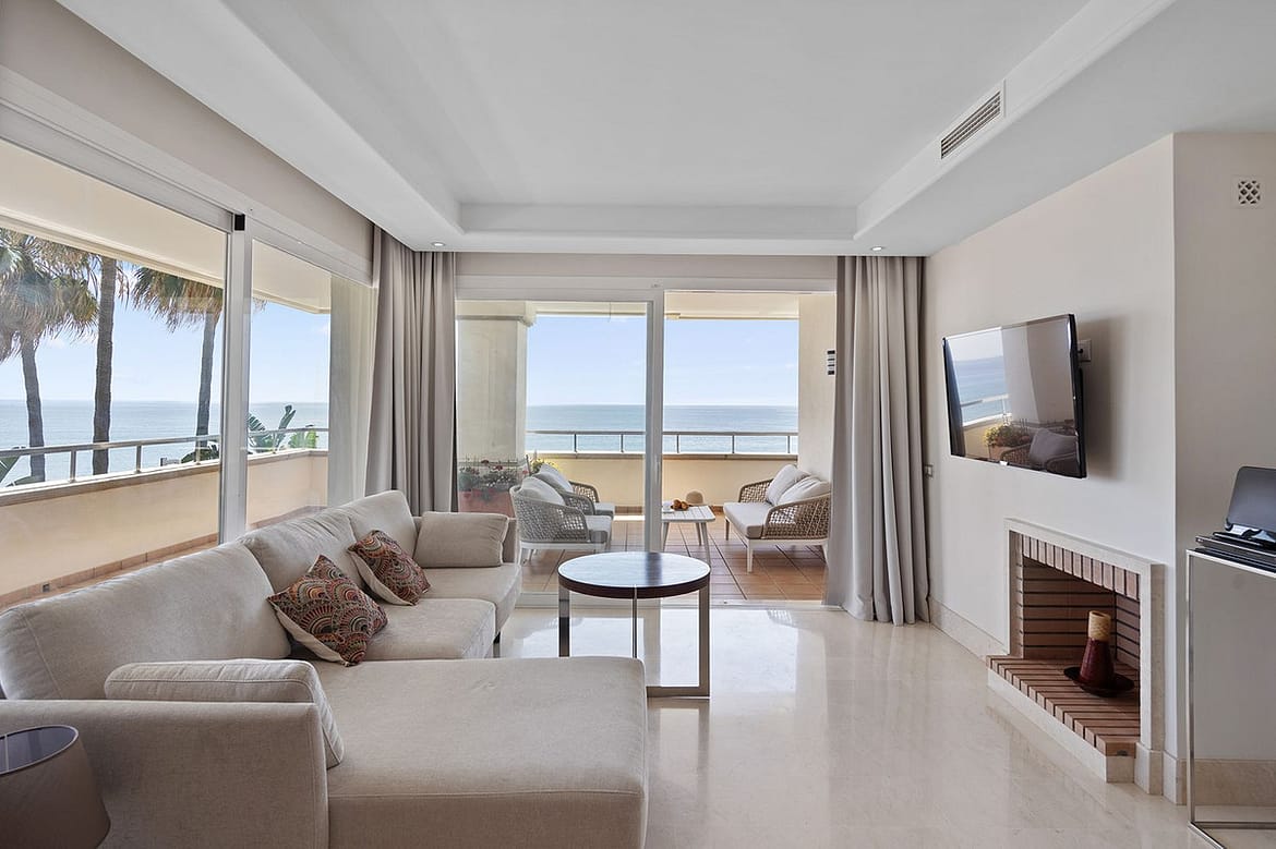 This three-bedroom apartment is situated on the first floor in the closed urbanisation "Heaven Beach" in Estepona.