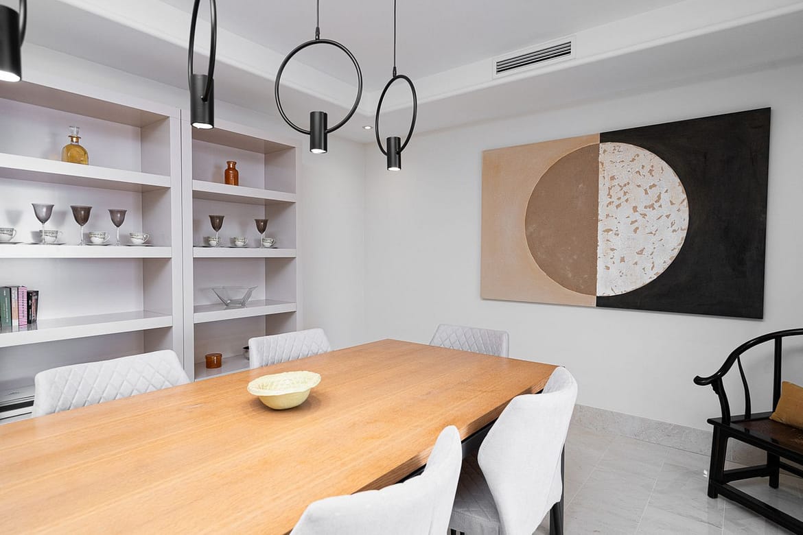 The terrace is very spacious and furnished, allowing you to relax in the sun and enjoy the sound of the waves. Big windows connect the terrace to the living room, giving it natural light, which comes with a lounge to wind down and a dining area for the whole family. Separated from the living room, you'll find a big and fully equipped kitchen with access to the laundry room.