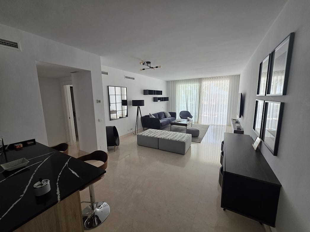 It features a spacious living room connected to its modern kitchen and direct access to the terrace. Additionally, one of its bedrooms is connected to the covered terrace.