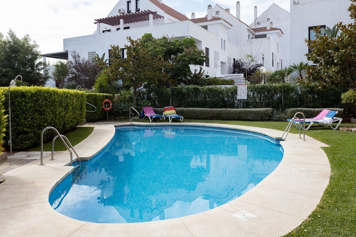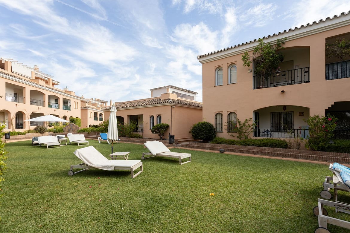 Closed urbanization with well-kept gardens and communal pool.