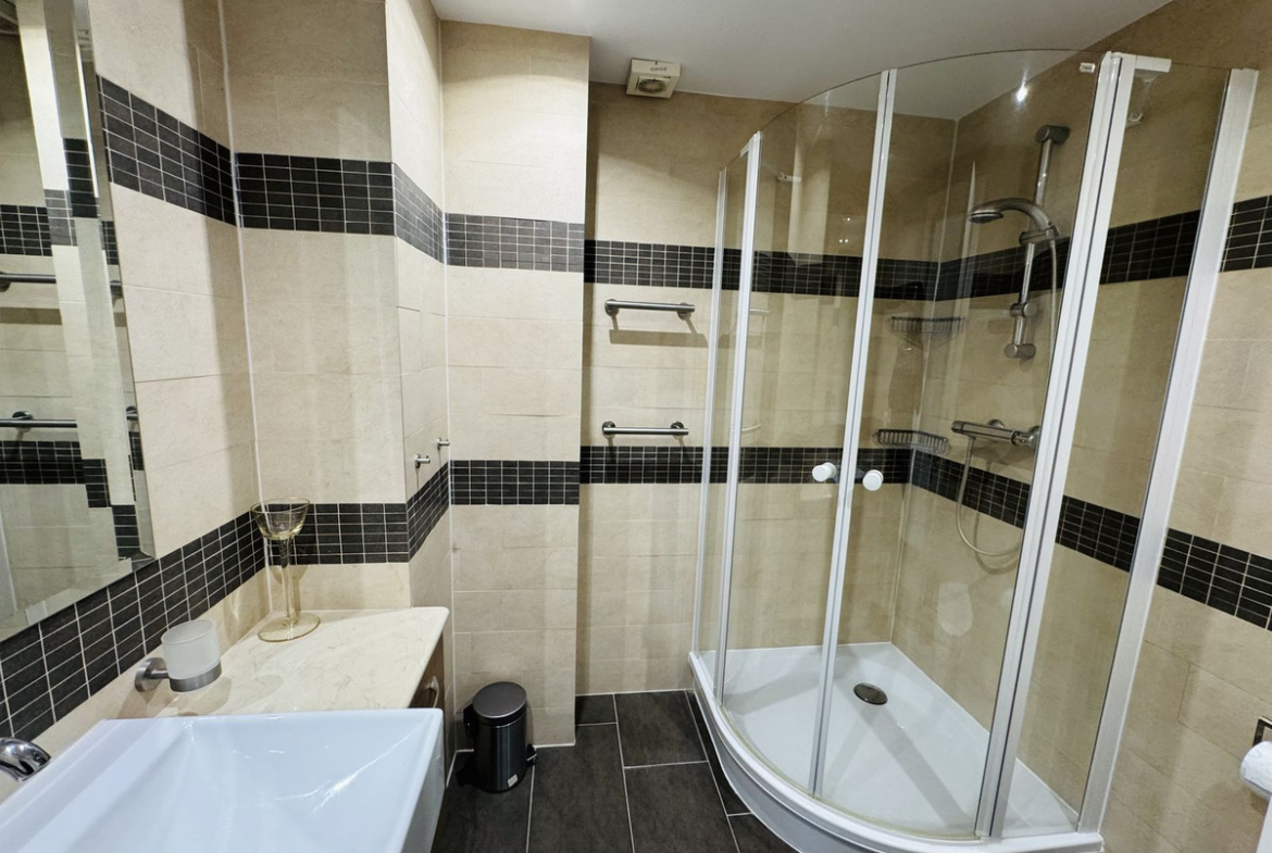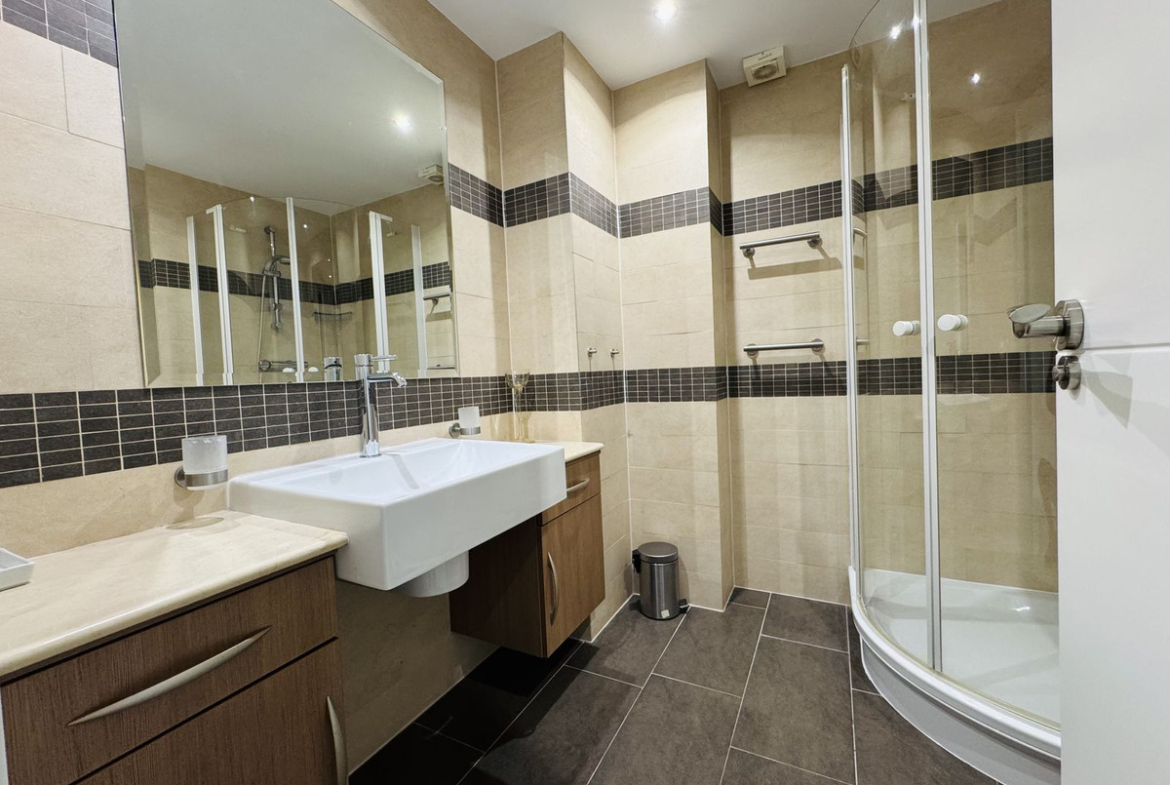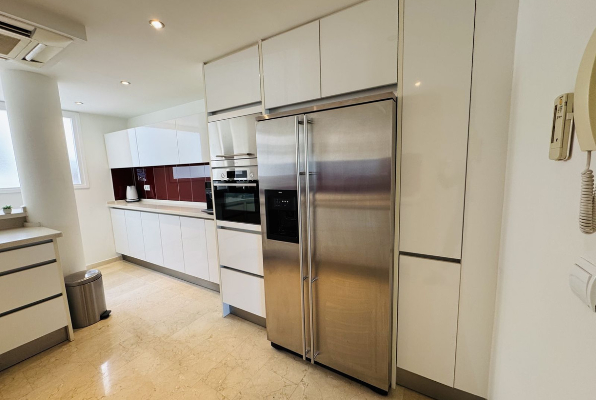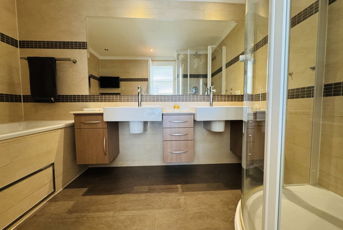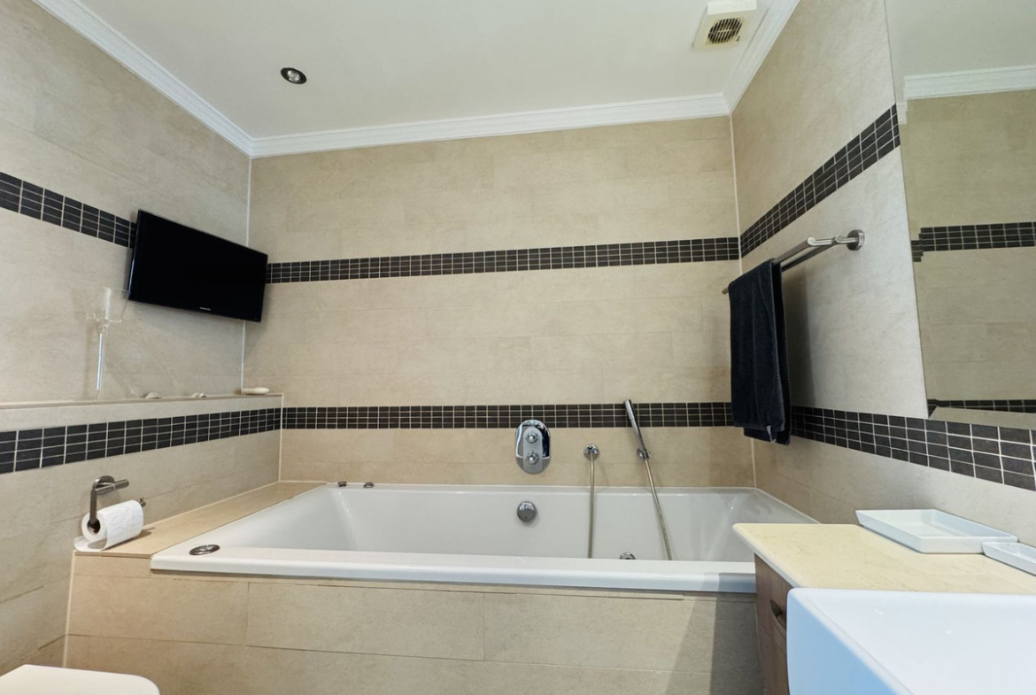 The master bedroom has a dressing room and ensuite bathroom, while the other two bedrooms offer sea views and built-in wardrobes. The bathrooms are equipped with a shower and bathtub for your comfort. A large closed garage of 46.41 m2 valued in 100.000€ is included in the price.