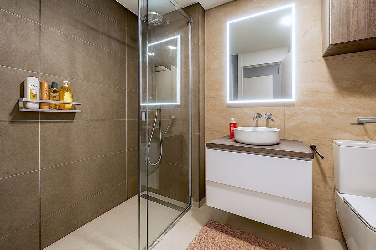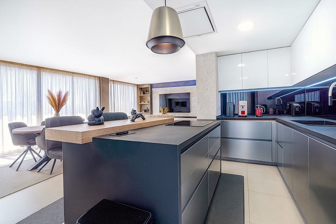 It has hot/cold air conditioning controlled by the best Air Zone home automation control system, underfloor heating throughout the interior area, LED lighting, designer kitchen with NEFF appliances, dressing areas in the bedrooms and large porcelain floors.