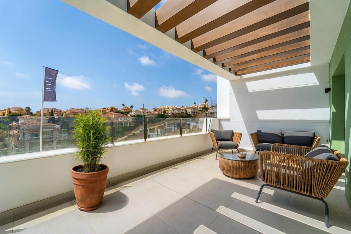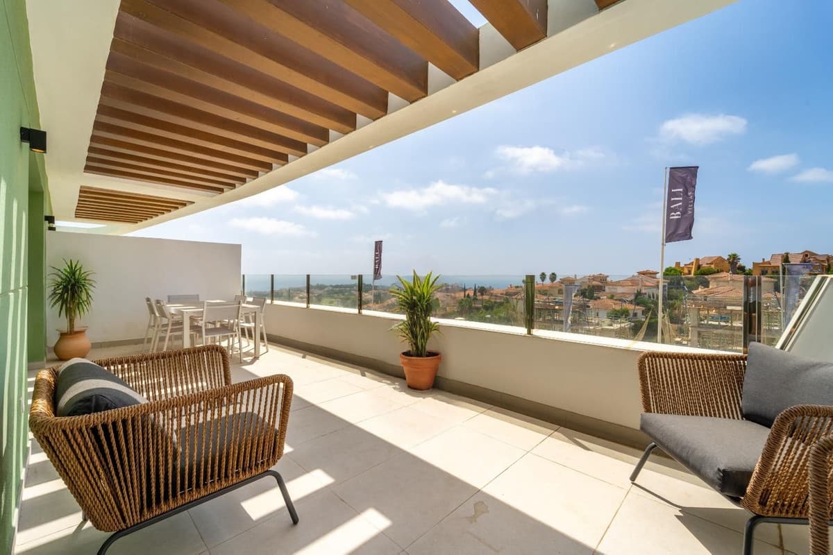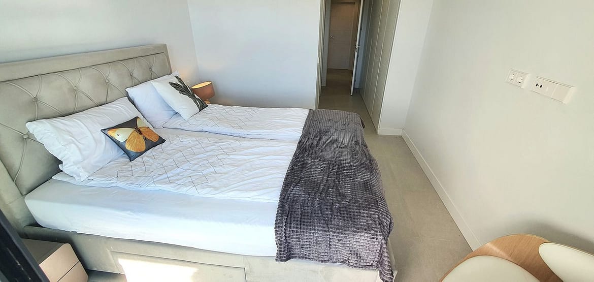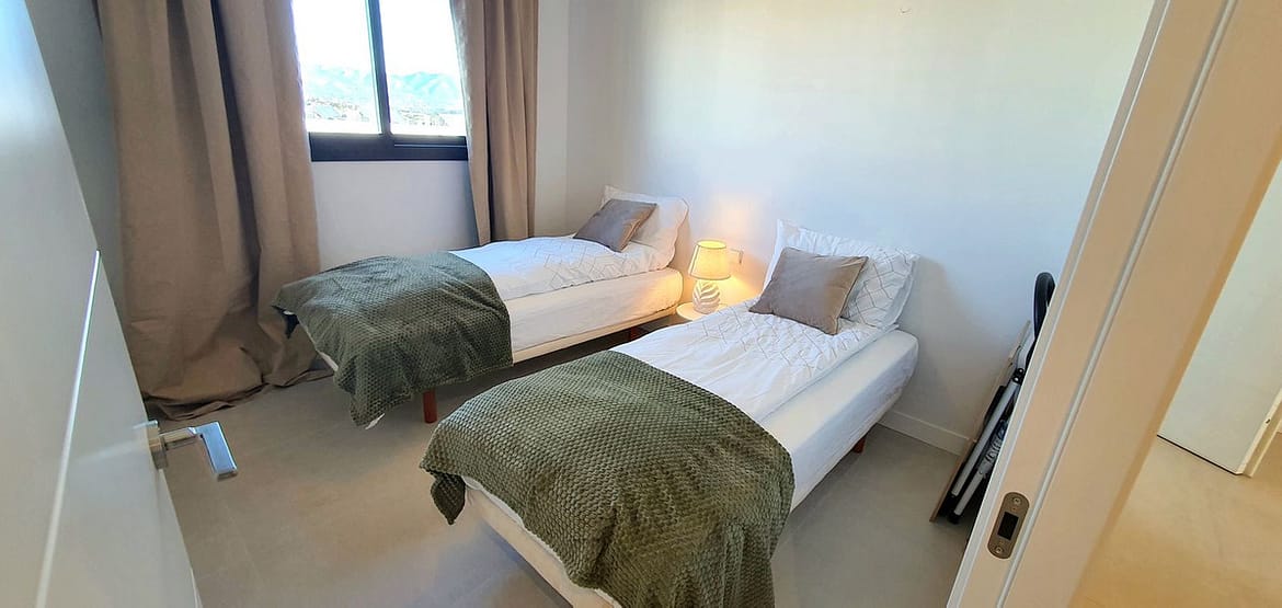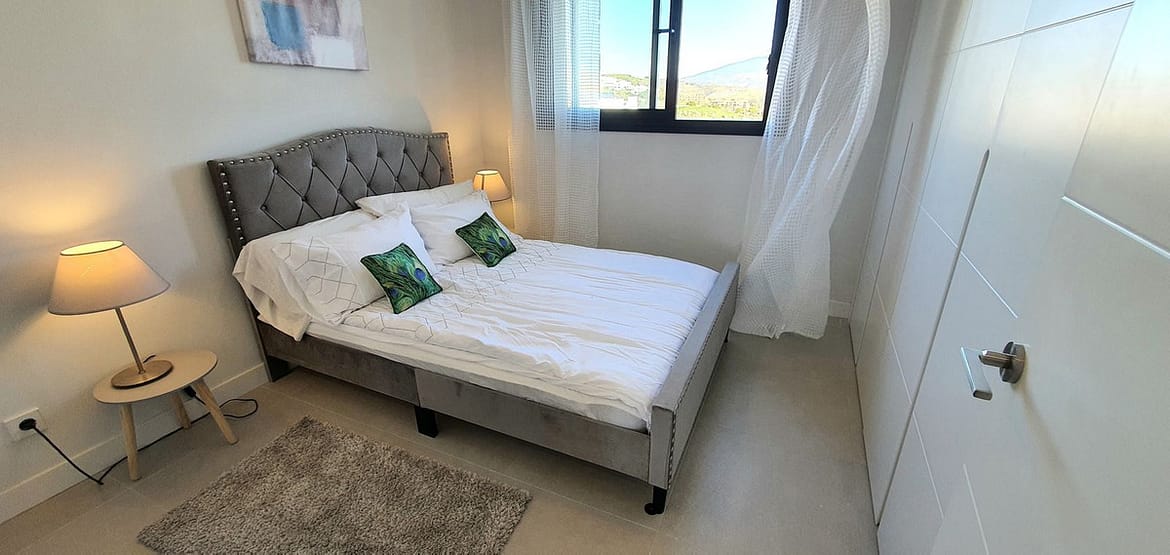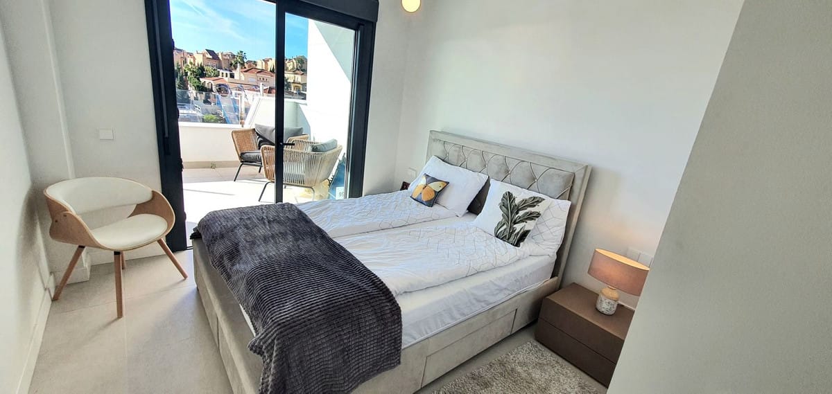 The principal bedroom also enjoys sea views, ample wardrobe space, and a stylish en-suite bathroom. Two additional bright and well-sized double bedrooms feature built-in wardrobes and views over the pool, surrounding hills, and golf course. A guest bathroom with a bath/shower completes the accommodation.