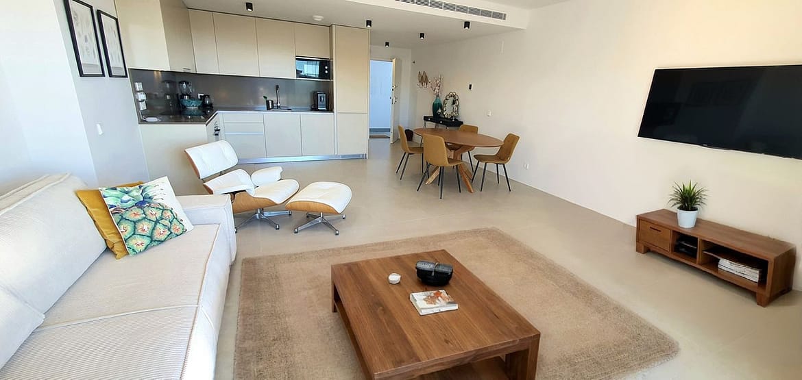 The open-plan kitchen and living area create a wonderful sense of flow, interaction, and energy, opening onto a southwest-facing terrace with beautiful sea views, an ideal setting for enjoying sunsets with family or friends over dinner.