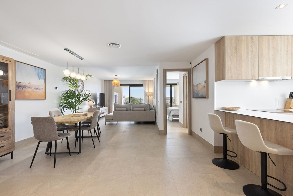 The apartment is thoughtfully designed across a single level, making it both practical and luxurious. The spacious open-plan living and dining area flows seamlessly into a fully fitted modern kitchen, equipped with high-quality appliances and ample storage, perfect for hosting family and friends.