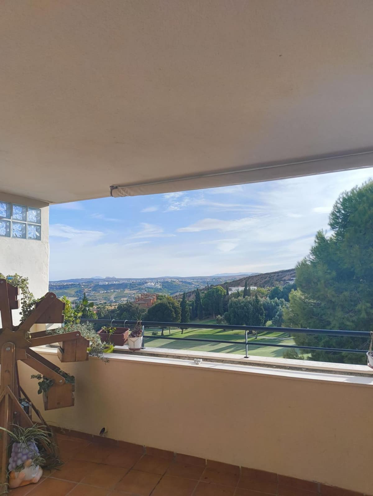 One of the property’s main highlights is its private 120 m² solarium, directly accessible from the apartment. This exceptional outdoor space can be arranged into different relaxation areas, a dining corner, a lounge area, or even a jacuzzi, all while enjoying breathtaking views over the surrounding golf course and the distant Mediterranean Sea. The open panoramic scenery creates a peaceful and exclusive atmosphere, ideal for unwinding or entertaining in complete privacy.