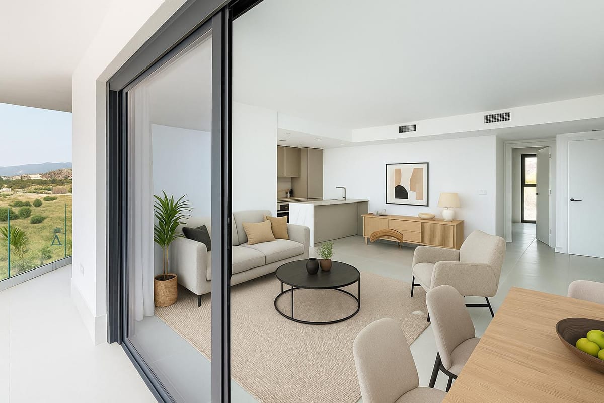 Brand-new and ready to move in! This elegant three-bedroom, two-bathroom apartment islocated on a high floor and stands out for its natural light, thanks to its corner position andexcellent southwest orientation. From the spacious 25 m² covered terrace, you can enjoysun all day long and breathtaking 180° open views of the sea and mountains. The layout isboth practical and welcoming, featuring an open-plan living and dining area connected toa fully equipped kitchen with high-quality finishes. The master bedroom includes an en-suite bathroom, while the other two bedrooms share a second full bathroom. Highlightsinclude double-glazed exterior carpentry, underfloor heating in the bathrooms, and anenergy-efficient aerothermal climate control system. Energy rating: A.
