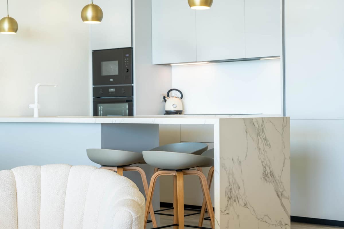 The interior layout is carefully arranged. The living and dining area extends across 36.56 m², directly connected to the terrace, creating an ideal setting for entertaining or quiet retreat. The Italian Zampieri kitchen is fitted with AEG appliances and finished with clean architectural lines and functional storage. Saloni ceramic flooring runs throughout the home, reinforcing a cohesive aesthetic.