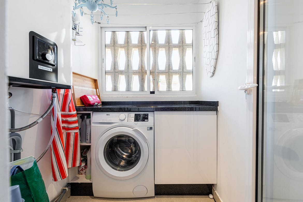 As you enter, you’ll find the tastefully renovated kitchen to your left, which is connected to a utility room designed in the same style.