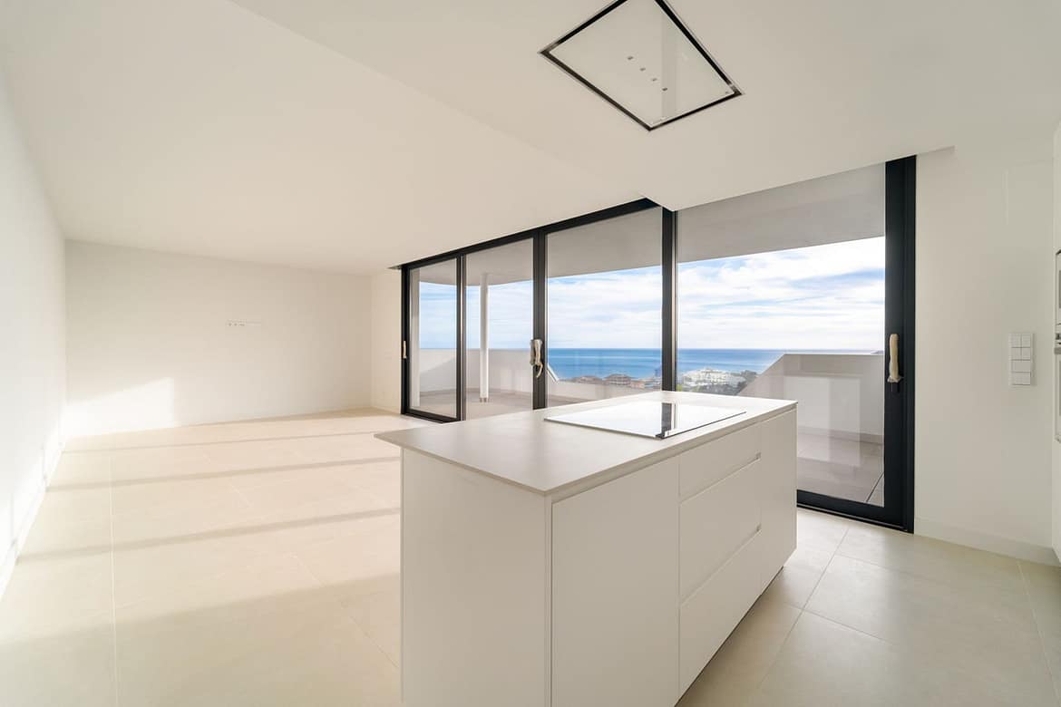 From every corner of the bright open-plan living area – whether relaxing in the lounge or cooking in the contemporary kitchen – you can enjoy breathtaking panoramic views stretching over the coastline, the sea, and the marina.