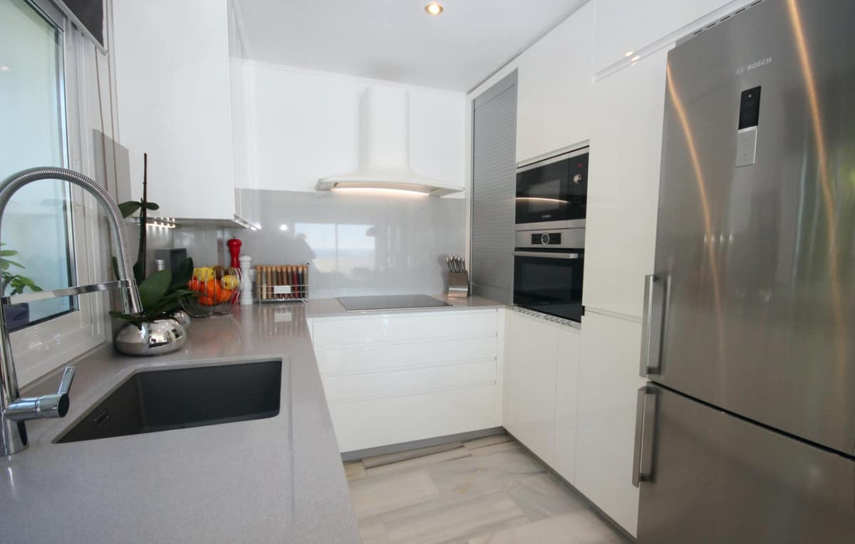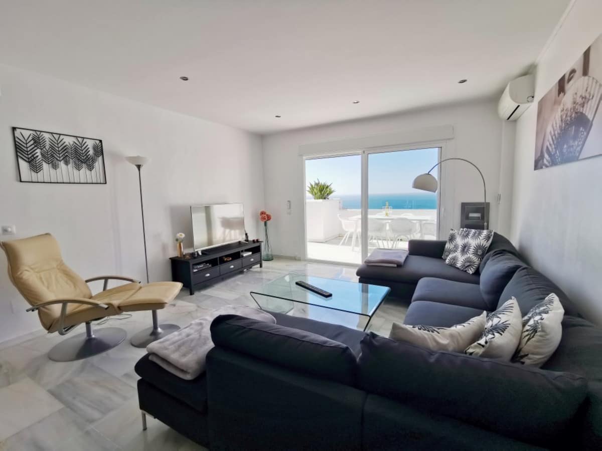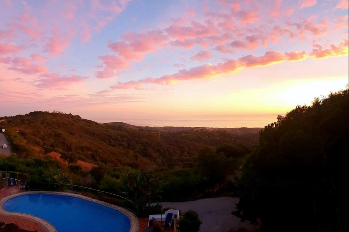 WHAT A VIEW! This superb south facing 3 bed corner duplex apartment lies on the hills of Elviria and boasts utterly breathtaking views to the sea towards the coasts of Africa. Probably the best unit in this small complex of 28 neighbors only, the apartment has been tastefully refurbished and upgraded, is in excellent condition and perrfectly equipped. The property features on a main floor a good size living-dining room open onto a superb terrace with commanding views, luxury open plan kitchen with Silestone work-top and Bosh appliances, one double bedroom with large wardrobes opening onto the main terrace and one bathroom with large walk-in shower. The lower level accommodates the 2nd and 3rd bedrooms both with large wardrobes sharing a large bathroom and a beautiful covered terrace with stunning views as well. This property is by far the most private within the complex and benefits from a large rear patio with al-fresco dining and BBQ area and a private storage room. The community is gated, very peaceful and private, perfectly integrated in the naturals surroundings with a superb swimming-pool and parking spaces. Ideal for long term stay or family holiday. It really worths a viewing.