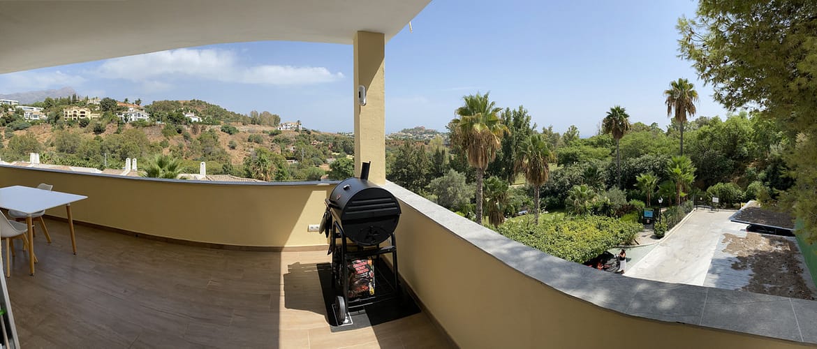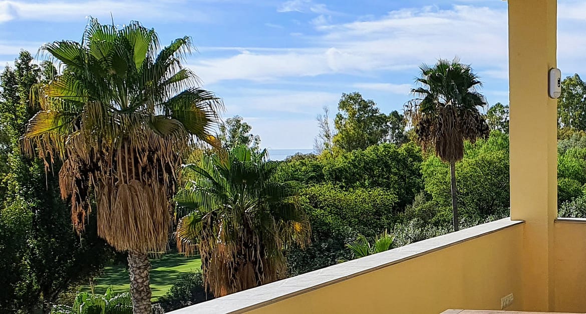 Outdoor spaces are equally impressive, with a private terrace and balcony offering breathtaking panoramic views of the sea, mountains, and the adjacent golf course. The covered terrace provides a serene spot for relaxation, while the communal pool and garden areas enhance the lifestyle on offer. Residents also benefit from a communal garage and lift access, ensuring ease of living.