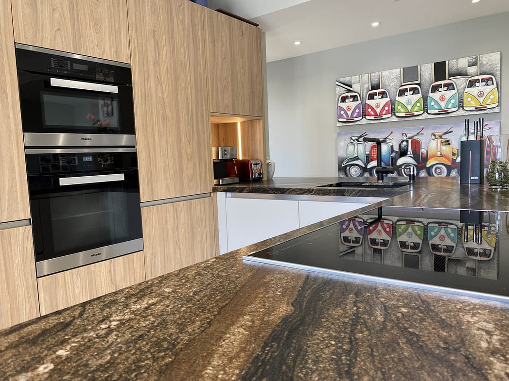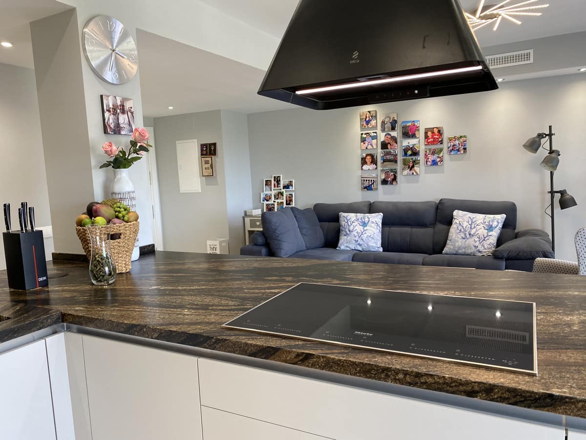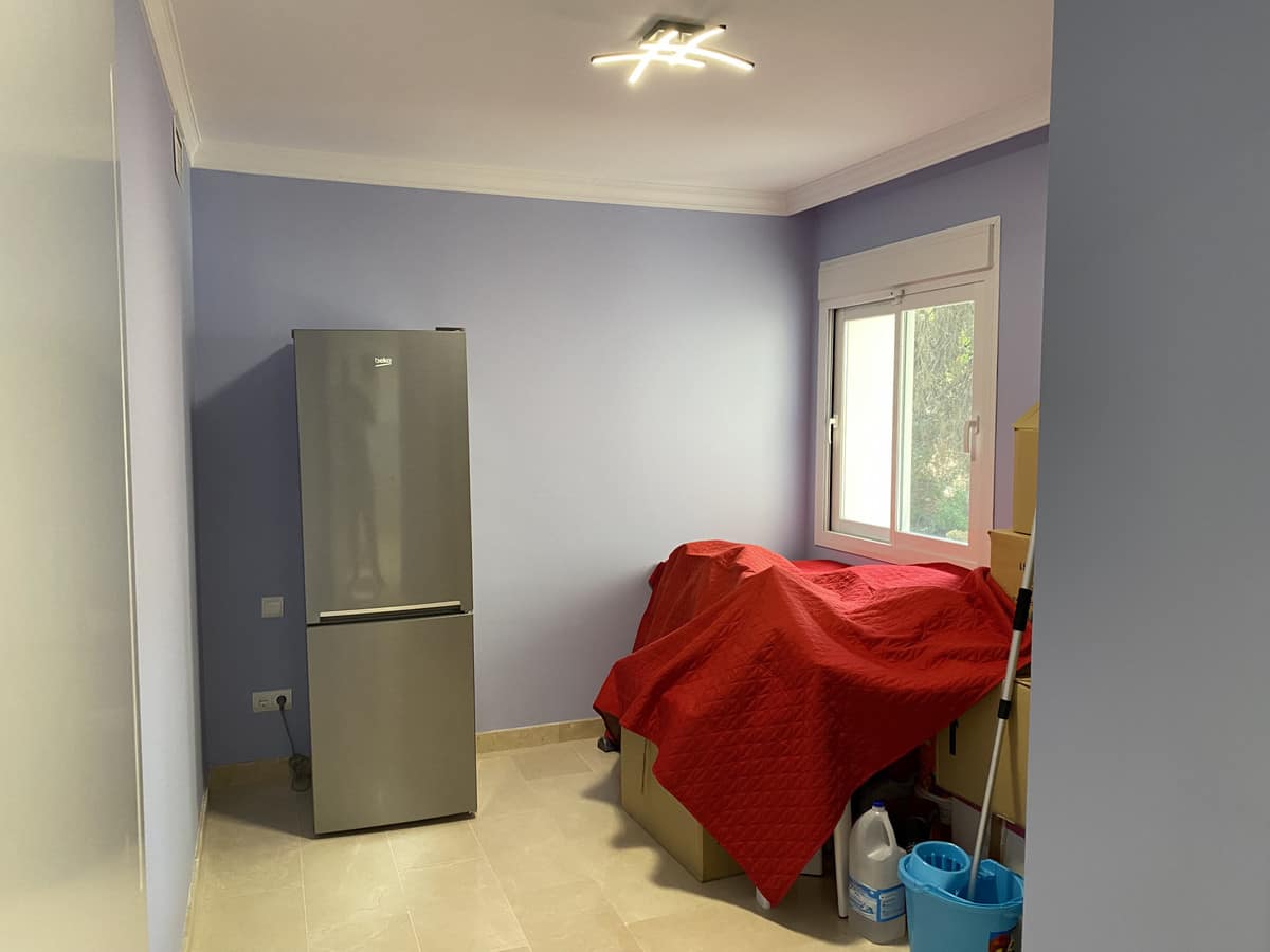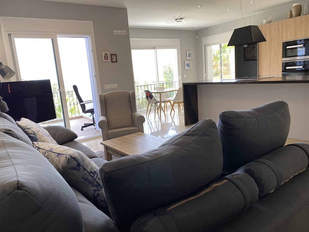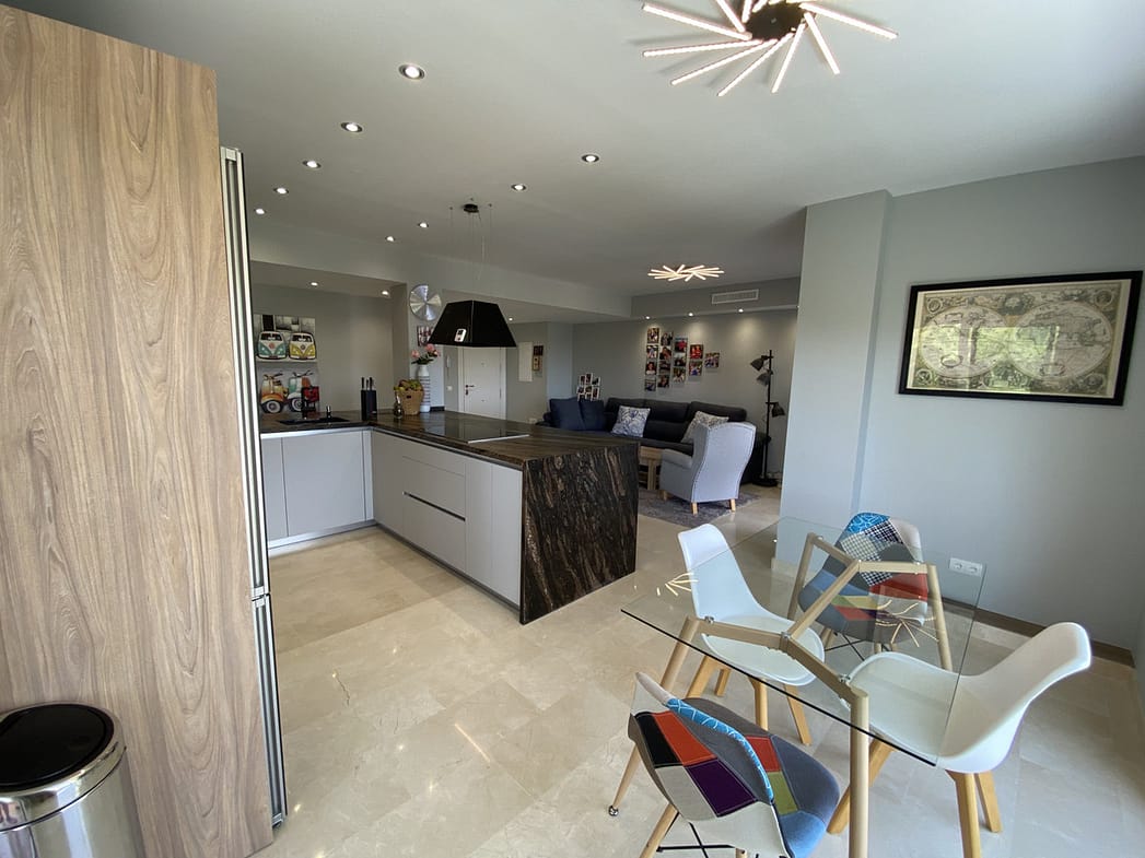 The apartment features three spacious bedrooms and two modern bathrooms, making it ideal for families or those seeking a refined retreat. The open-plan kitchen is fully fitted and equipped with premium appliances, seamlessly blending into the elegant living space. The property comes fully furnished, with fitted wardrobes and tasteful decor that complements its contemporary design. Additional conveniences include a laundry room, storage room, and a ceiling cooling system powered by advanced aerothermics technology.