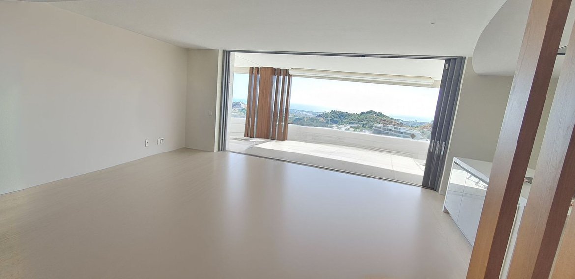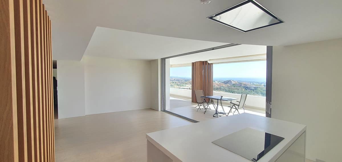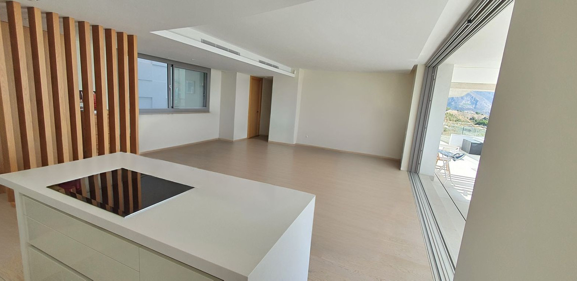 As an upgrade, the property includes wooden flooring in the main living area, high ceilings, abundant natural light, and water-based underfloor heating throughout. The spacious open-plan living area flows effortlessly onto a large terrace, providing the perfect setting to enjoy the spectacular panoramic views.