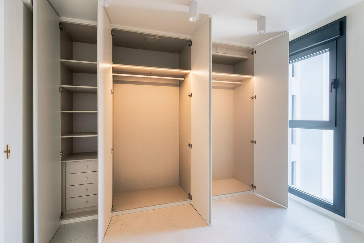 Built-in wardrobes with lined interiors.