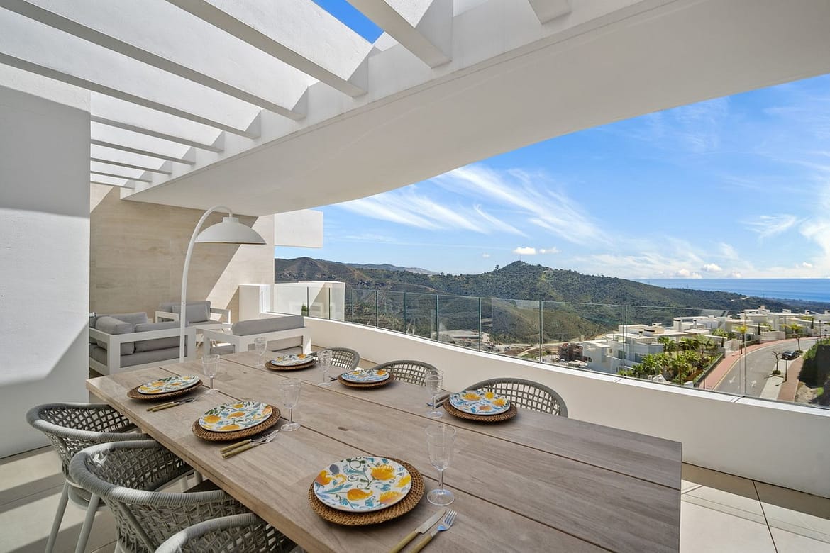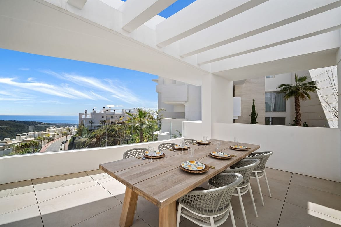 Impressive contemporary flat, with sensational sea and mountain views. Las Jacarandas has two private outdoor pools with children's play areas and gardens. Residents also have full access to all the amenities of Palo Alto including, concierge services, a world-class health club, horse riding, spa and beauty facilities, paddle tennis courts, gym, tennis courts, a social club, a kids club, and endless space to enjoy the natural beauty of Sierra de las Nieves.
