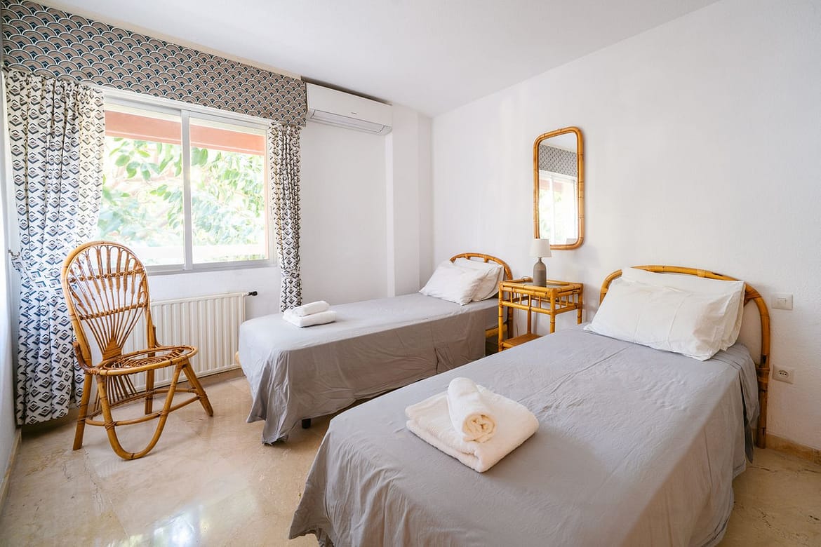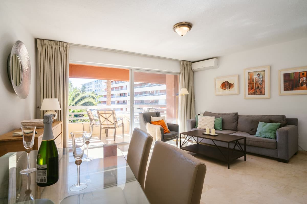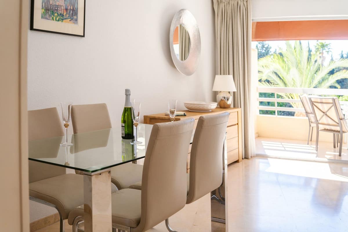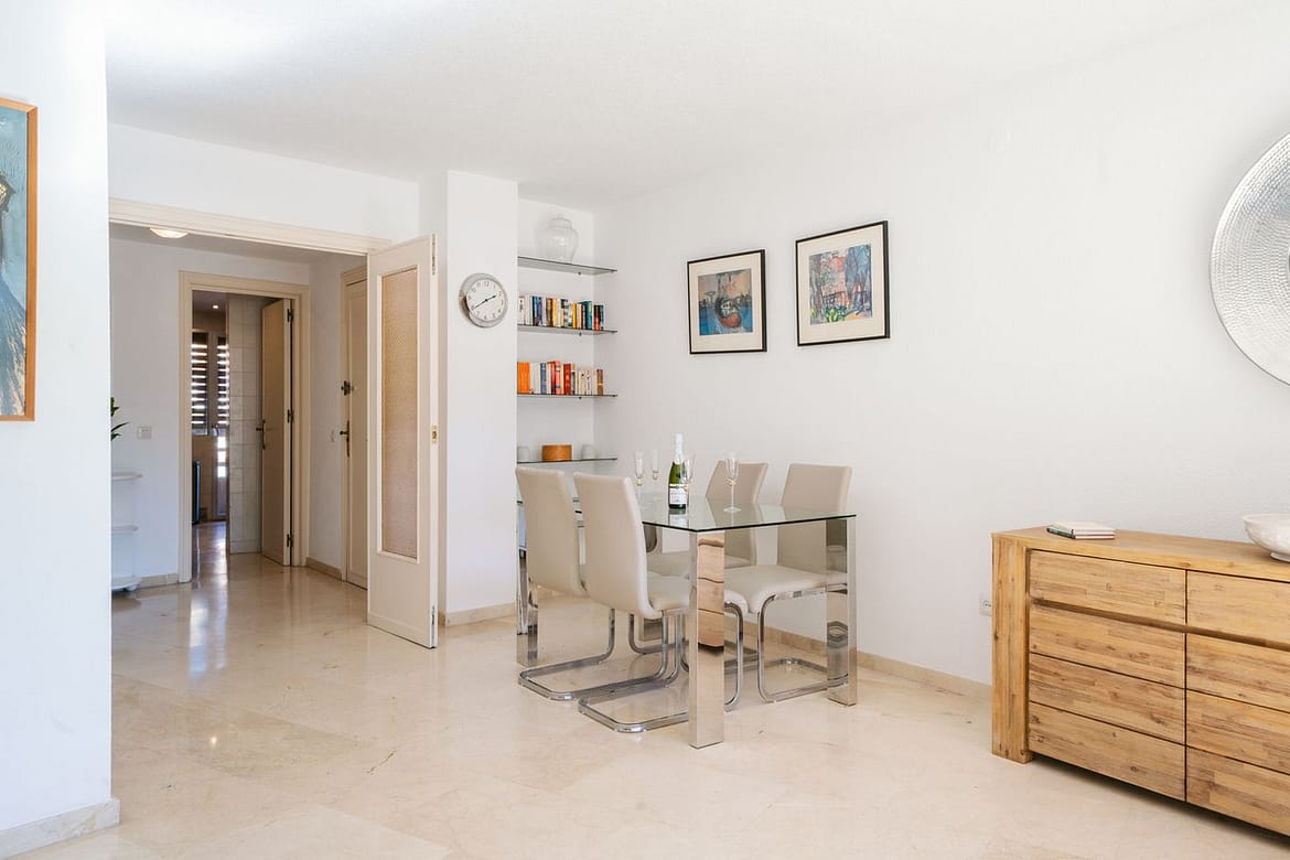 The bright living room offers an excellent space to enjoy both dining and relaxation by the TV. You can also step outside to a wonderful south-facing terrace that overlooks the pool, where you can enjoy al-fresco dining or evening drinks, whilst knowing that you have everything Marbella has to offer right at your doorstep. The kitchen is ample in size, and as a bonus, a gas stove connected via natural gas, which is perfect for those who enjoy cooking.