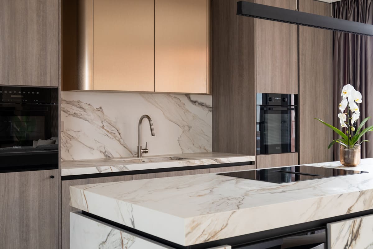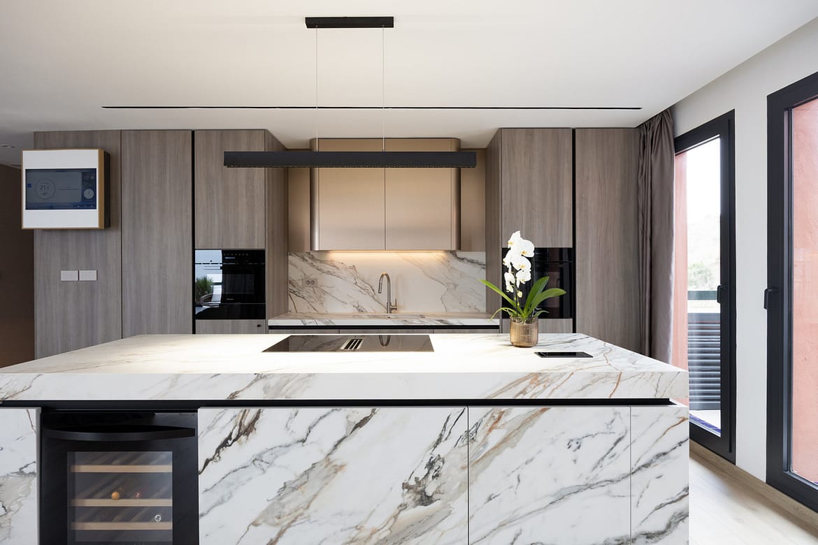 Inside, the 70 m² open-plan living, dining, and kitchen area welcomes abundant natural light, creating an atmosphere of spacious elegance. The home includes three serene bedrooms and three beautifully appointed bathrooms, with the master suite offering a designer freestanding bathtub and wall-mounted rainfall shower. Every detail reflects craftsmanship and harmony: Arklam stone countertops, a statement kitchen island, Miele premium appliances, and a built-in wine cooler complement Austrian-made furniture boards and tailor-made storage solutions. Warm Belgian flooring and Hansgrohe brushed bronze fittings add understated sophistication, while motorised curtain rails and shutters bring effortless comfort.
