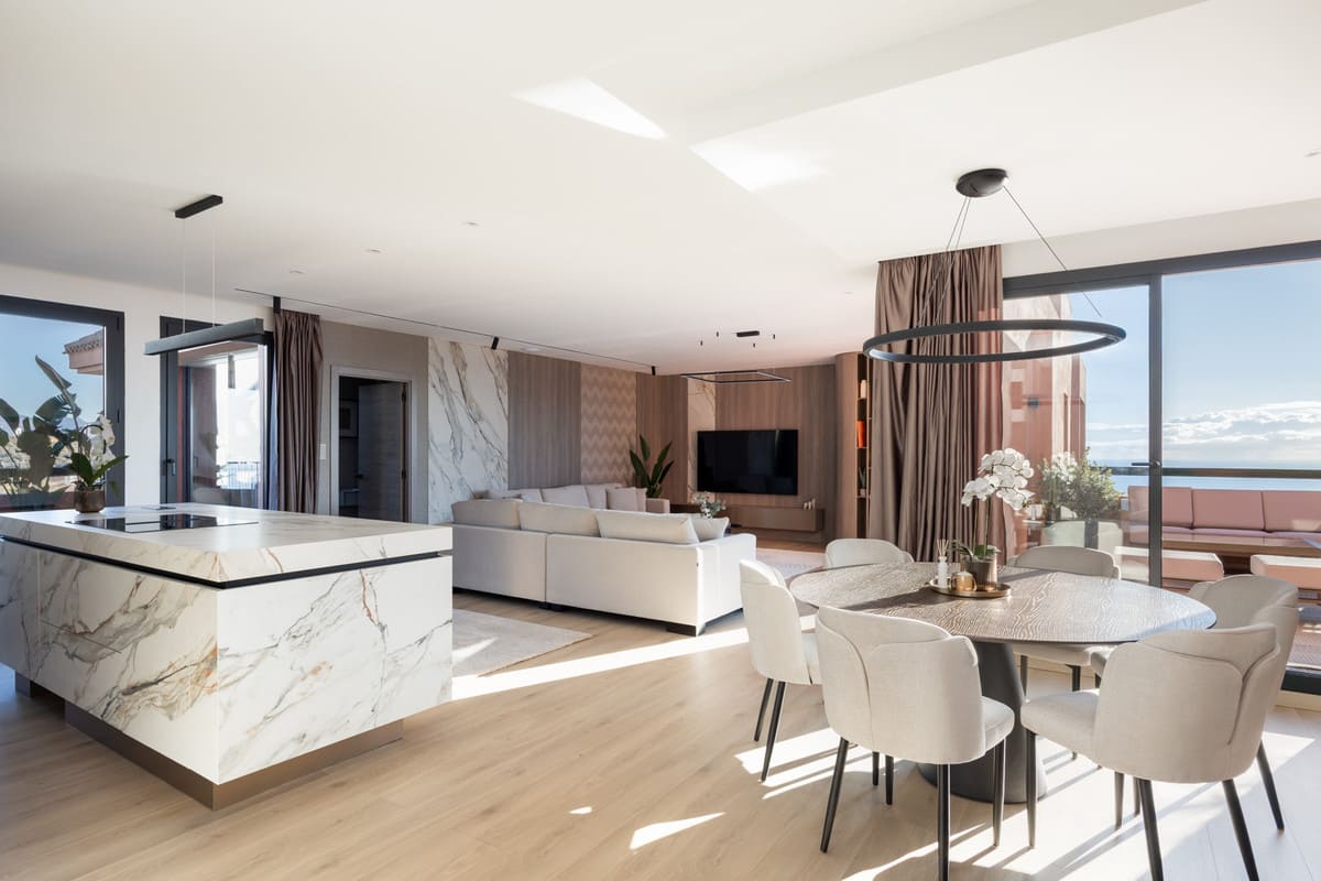 This exceptional residence offers an exquisite blend of design, comfort, and panoramic beauty. Spanning a built area of 145 m², the apartment features two private terraces totalling 45 m², each thoughtfully designed with lush greenery, an automatic irrigation system, and a private jacuzzi. The 270° views embrace the sea, coastline, and surrounding hills — on clear days, even Gibraltar and the distant coast of Africa grace the horizon. A private 14 m² garage with direct elevator access ensures convenience and exclusivity at every turn.
