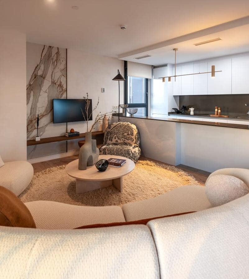 The apartment features a bright and functional layout, consisting of a spacious living and dining area with direct access to a private 12-square-meter terrace facing southwest. This orientation guarantees sunlight and natural brightness throughout most of the day, along with spectacular views of the urban skyline and coastline.