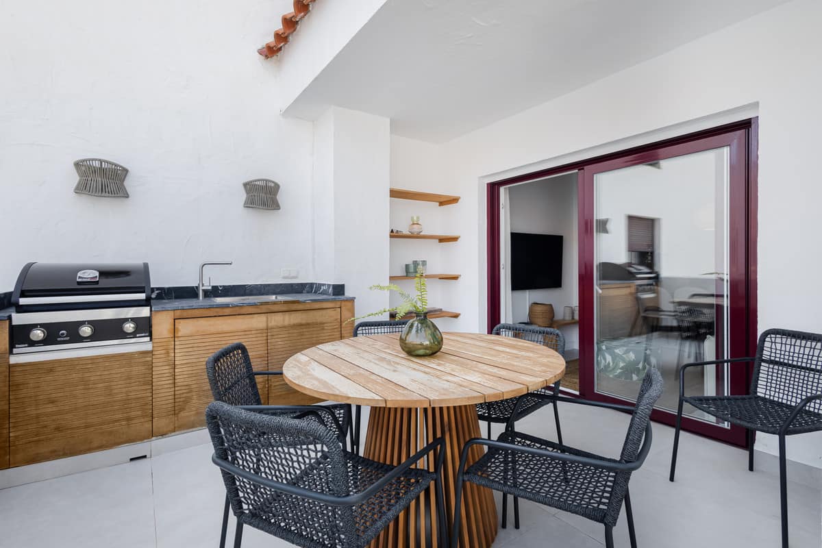 The open plan living area creates a light and airy atmosphere, perfect for both relaxing and socializing. Here you'll find an impressive kitchen island, which is ideal for socializing and cooking. The terrace is a real highlight, equipped with a built-in barbecue and an outdoor kitchen – perfect for enjoying delicious meals outdoors.