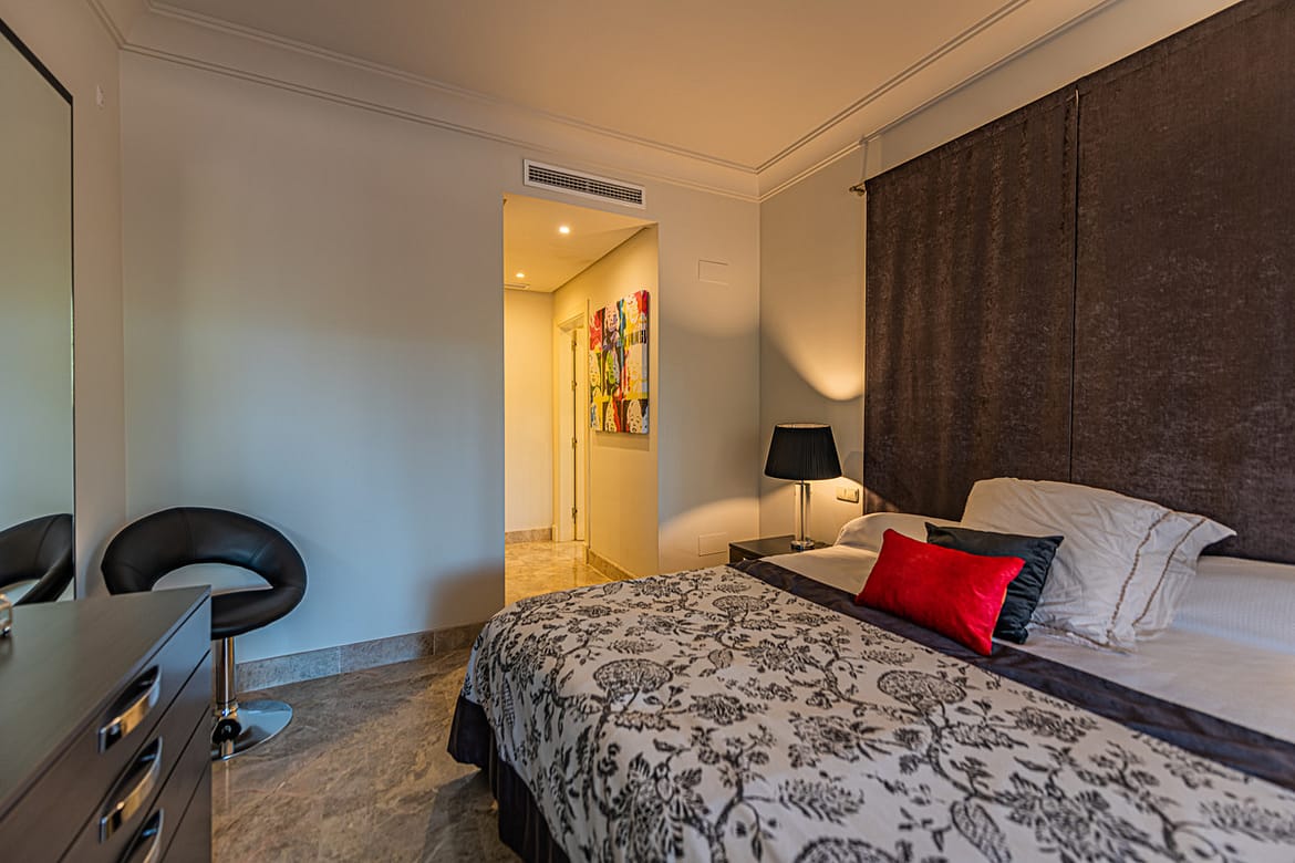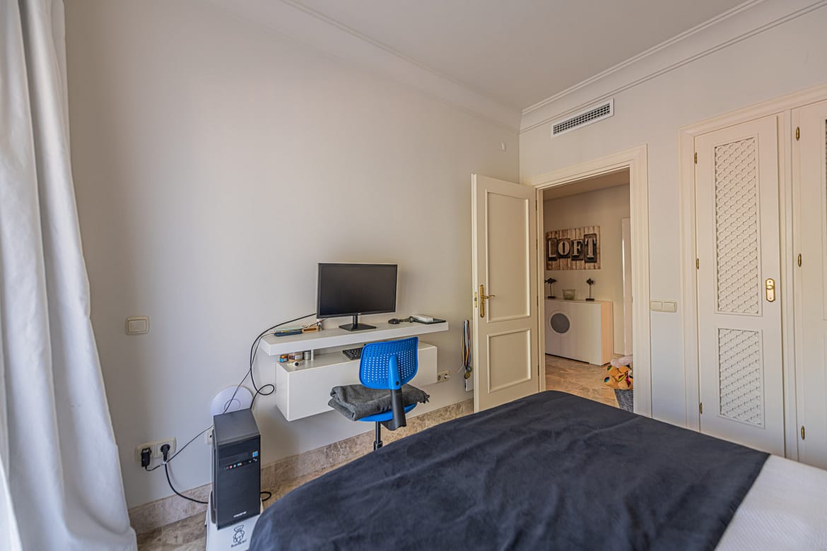 This is a High quality three bedrooms apartment on a first floor enjoy a fabulous location in the heart of the prestigious golf valley in Marbella, They are ideally situated within five minutes drive to the renowned marina of Puerto Banus with its beaches its shopping facilities, top restaurants and popular bars. The property has a bright and airy feel with lots of light south-east facing windows allowing plenty of light in. There are three terraces, one in the living room and two others in the bedrooms. From the main terrace you have direct views to pool. The finishes of the property are of a high standard and the apartment comes with underground parking and storage room.