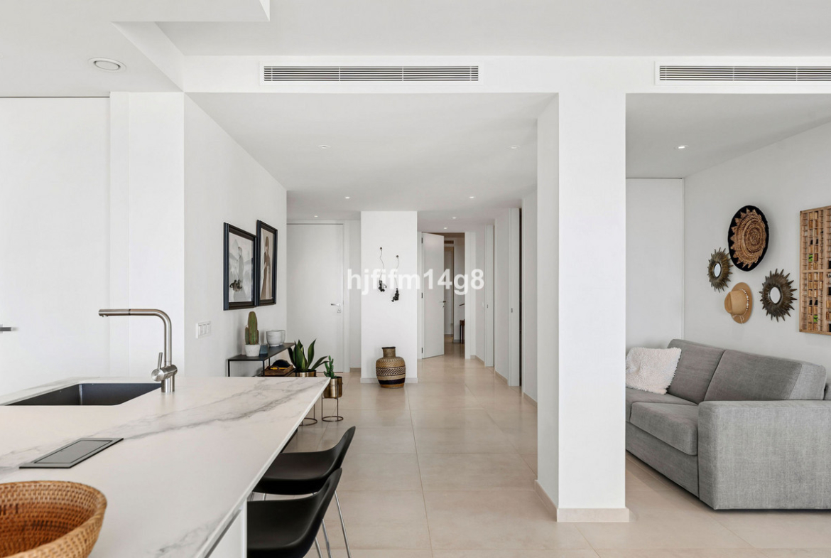 With floor heating throughout, you’ll stay cozy even during the cooler months, adding to the comfort and luxury of this home. As you enter, you’ll be immediately drawn to the panoramic sea views that greet you from the living area. The optimal south-southwest orientation ensures an abundance of natural light, creating a bright and airy atmosphere. There is direct access out to the terrace, where you can take in the stunning views and enjoy a seamless indoor-outdoor living experience. To the left of the entrance, you’ll find the guest toilet and the bedrooms. The apartment offers an impressive amount of storage space, with built-in wardrobes in the bedrooms and additional storage along the corridor leading to the bedrooms. The master suite is tastefully presented with a spacious bathroom featuring a shower and direct access onto the terrace. There are also two additional bedrooms, each with ample closet space and a shared bathroom.