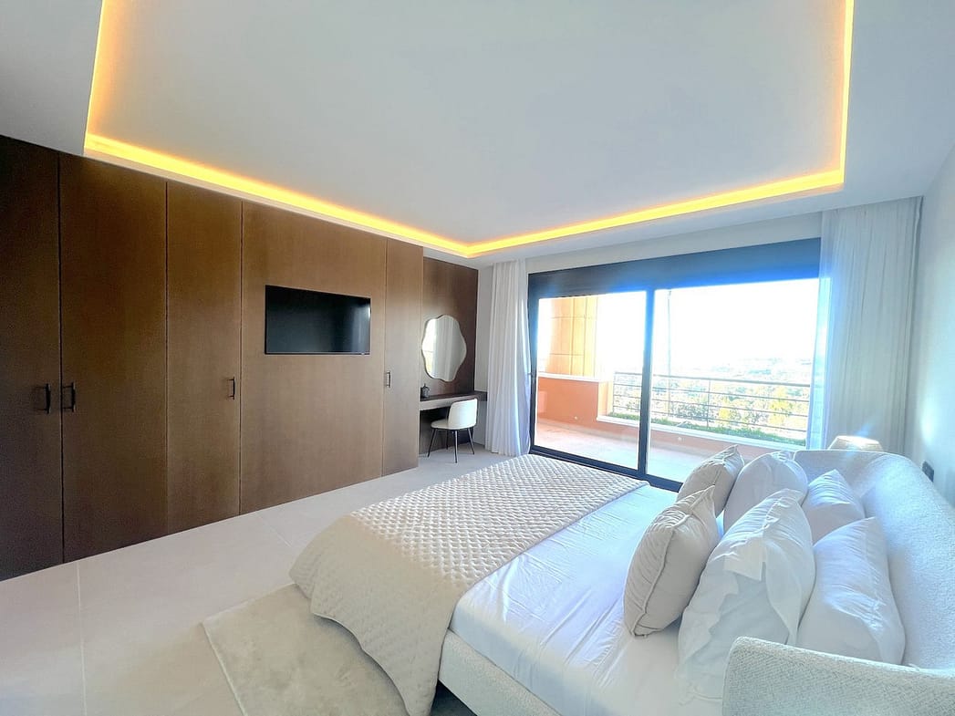 To the right of the living area, the luxurious master suite boasts a generously sized en-suite bathroom, a walk-in wardrobe, and access to a private terrace with sweeping panoramic sea views—an irresistible spot for morning coffee or sunset relaxation.