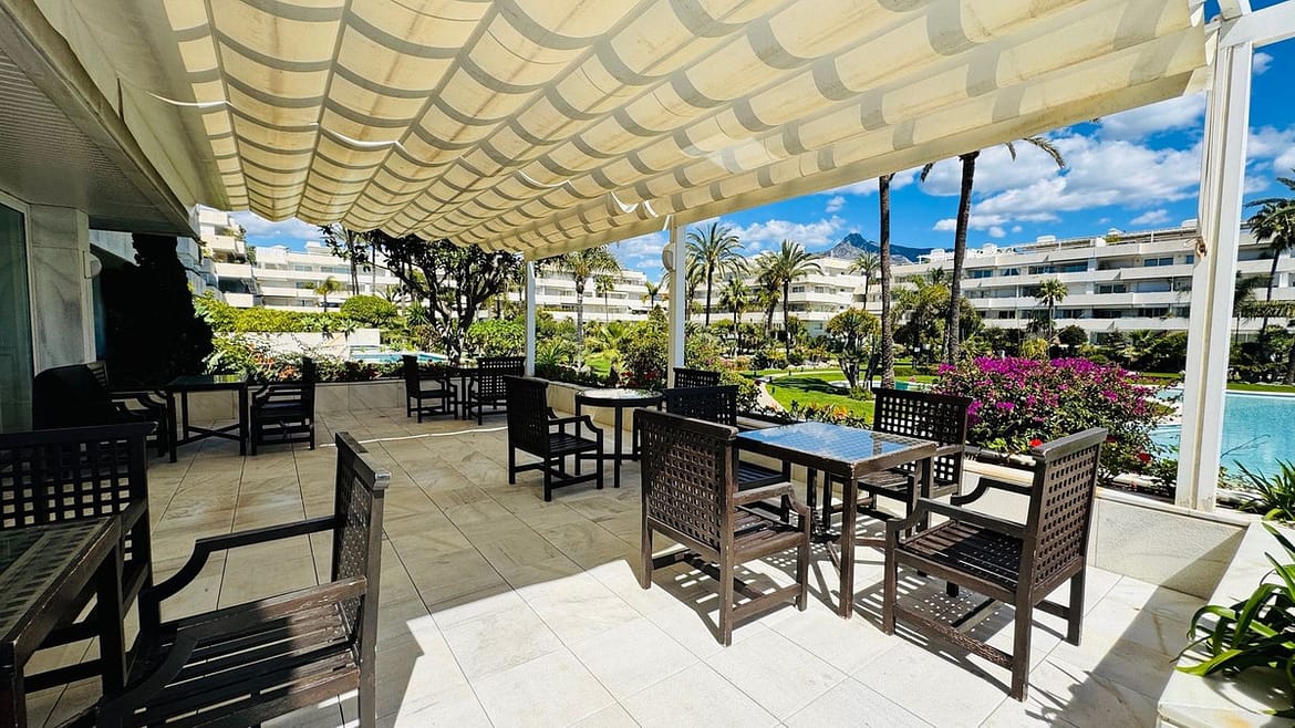 Rare opportunity! Stunning apartment located in one of the most sought after luxury community in Puerto Banus, near Marbella. The famous residential luxury community enjoys direct access to the promenade of Puerto Banus and the beach,and its multitude of beach restaurants. The community is gated with 24/24 security and boasts a beautiful indoor pool and spa with a fully equipped state of the art gym, a social club with a bar for the residents, as well as a popular restaurant opened from April to October. The residents and their children have access to a games room fitted with ping pong tables, billiard table and kids games for the little ones. A Sauna, Hamman and a jacuzzi are available in the spa area to the residents only. All is presented in a beautiful smart comfortable style and relaxed atmosphere found only in 5 stars luxury Hotels!
