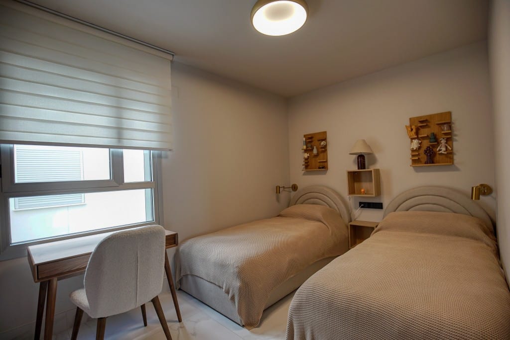 The master bedroom has an en-suite bathroom, while the two additional bedrooms share a modern family bathroom. High-quality finishes throughout, including marble floors, double-glazed windows, and central air conditioning for year-round comfort.