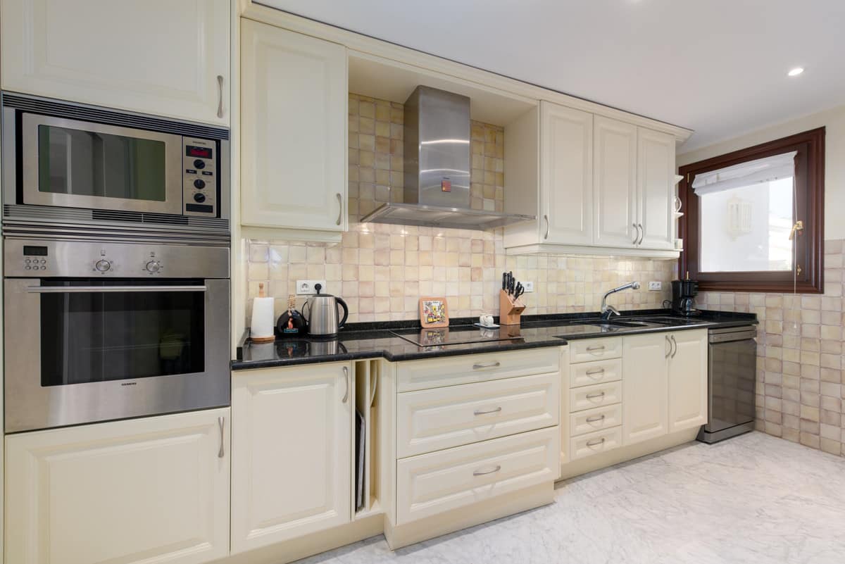 The property is classically appointed and comprises a large lounge with open fireplace, as well as three double bedrooms, each with its own ensuite bathroom; including the owners' bedroom suite which offers sea views and direct access to the terrace, as well as an oversize bathroom with jacuzzi bathtub, double basins and a walk-in shower, as well as a separate dressing area. There is a fully equipped kitchen which has Siemens appliances, a double American fridge, and a separate utility room with its own small terrace.