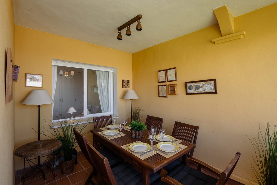 From the living room you have direct access to the covered terrace, where you will find a dining table with 6 chairs to enjoy meals with your family and friends outdoors.