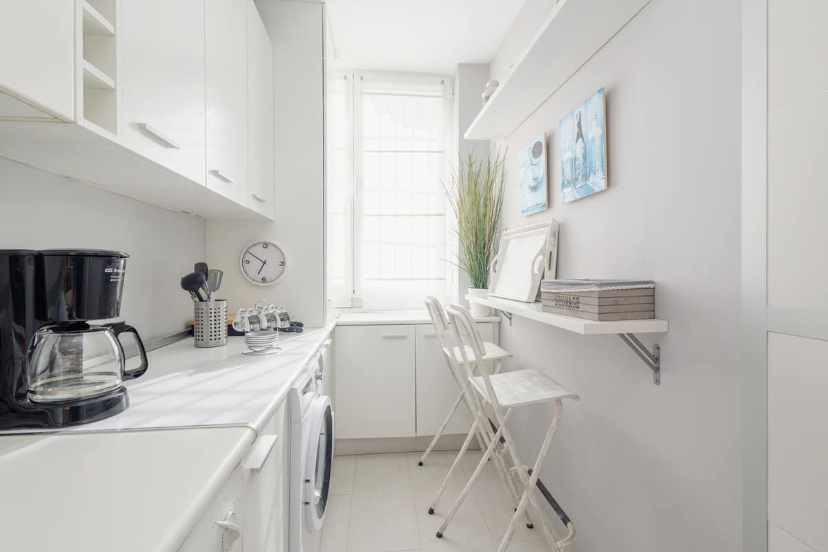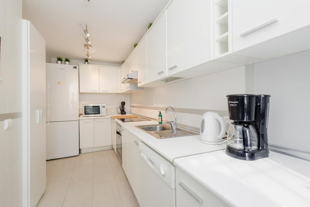The kitchen is fully equipped with a fridge, freezer, dishwasher, washing machine, oven, coffee maker, toaster, kettle and a mixer.