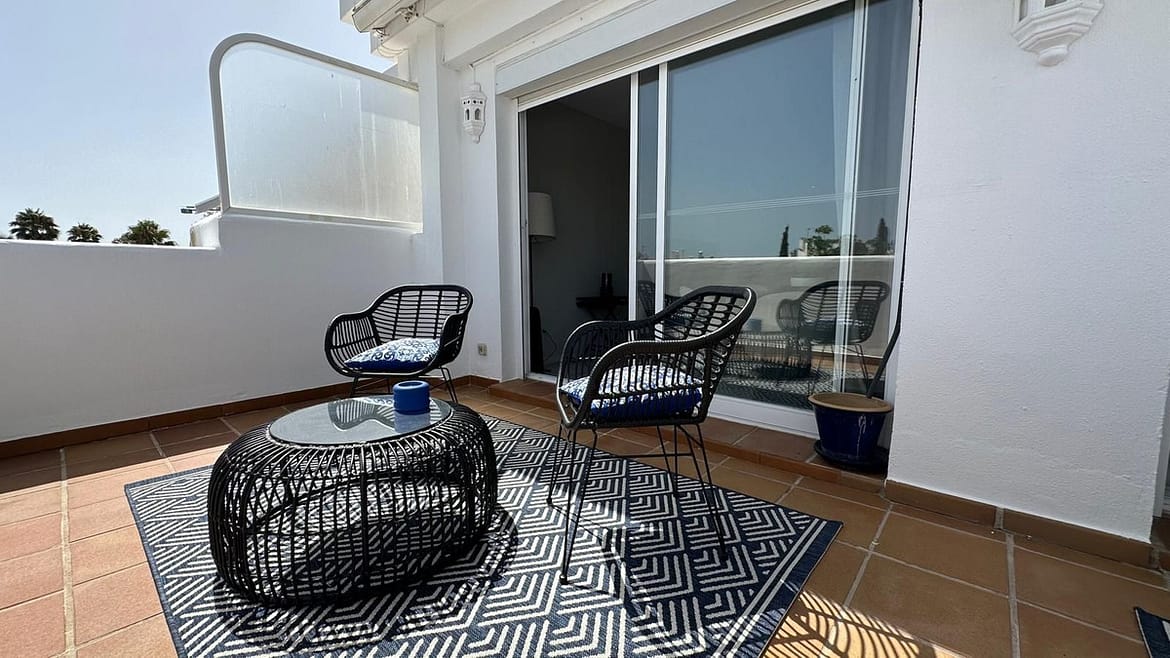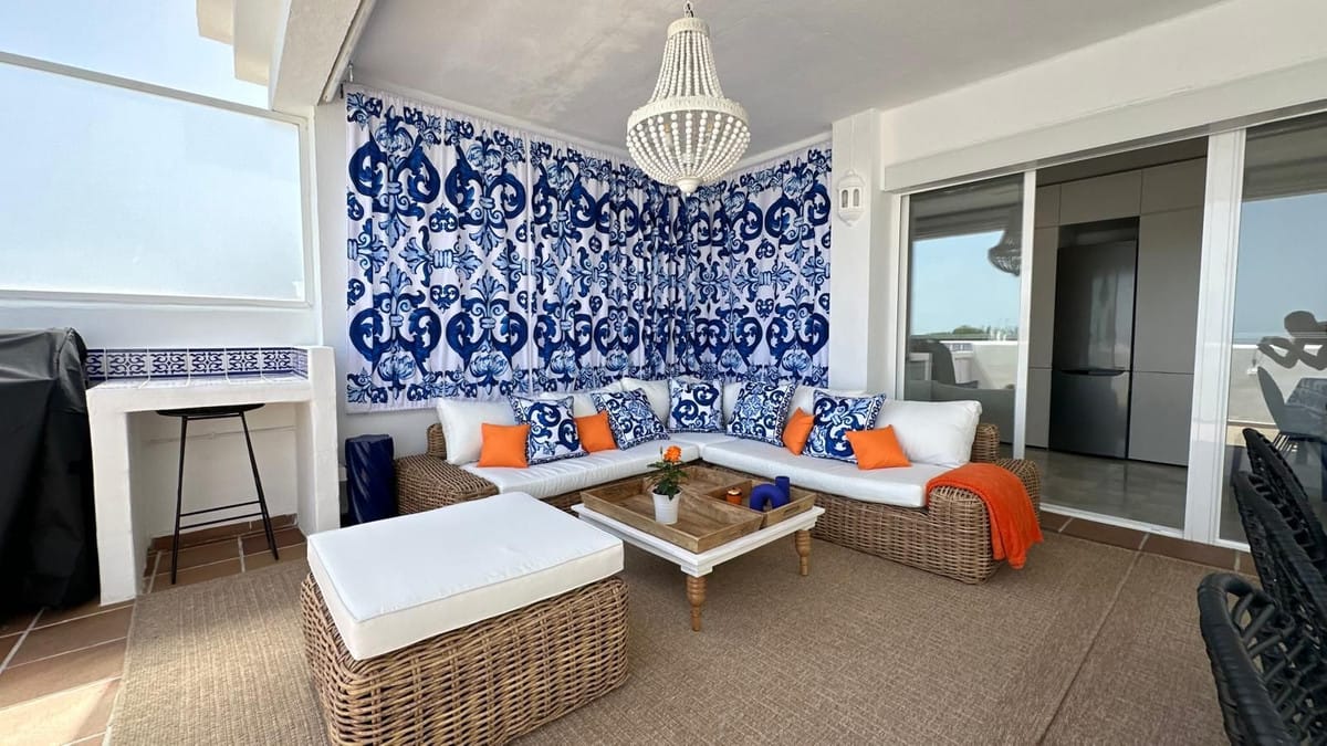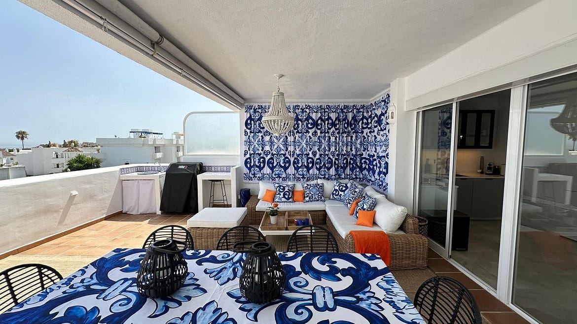 Perfectly situated, the penthouse is just moments from the beach, shops, restaurants, cafés, golf courses, and tennis courts, ensuring easy access to all amenities and leisure activities. Parking is conveniently available within the community, directly outside the property.