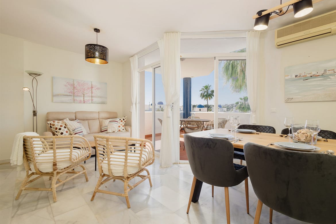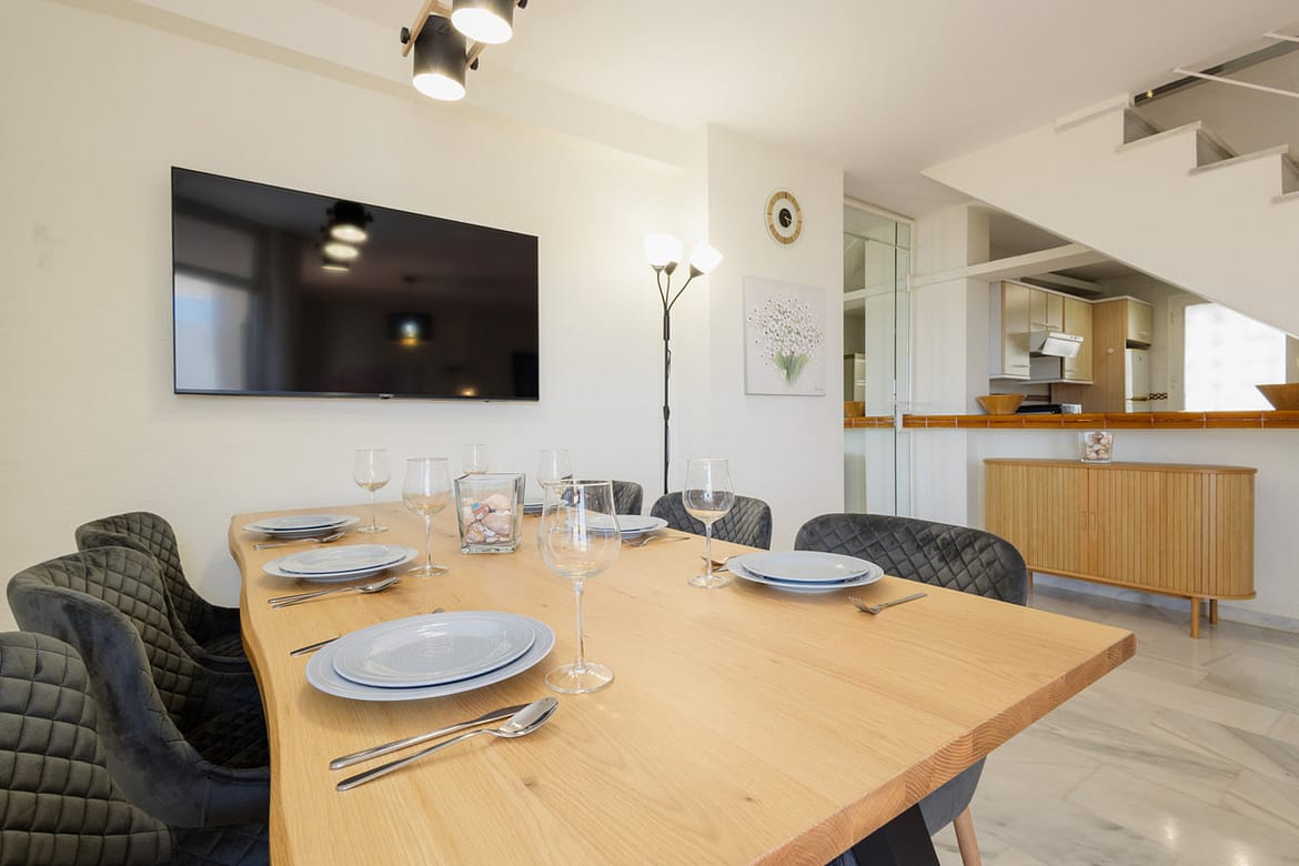 This bright two-story penthouse offers modern and functional spaces. Upon entering, you’ll find a spacious living-dining room elegantly decorated, featuring a comfortable sofa and a smart TV with international channels. A dining table for 8 people completes the space, perfect for meals with family or friends.