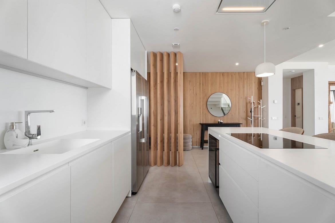The main floor opens to a spacious living and dining area with direct access to a large terrace that frames the home with Mediterranean views. Floor-to-ceiling windows create a fluid transition between the interior and exterior. The modern kitchen, with a functional and balanced layout, serves as the central hub of the residence.