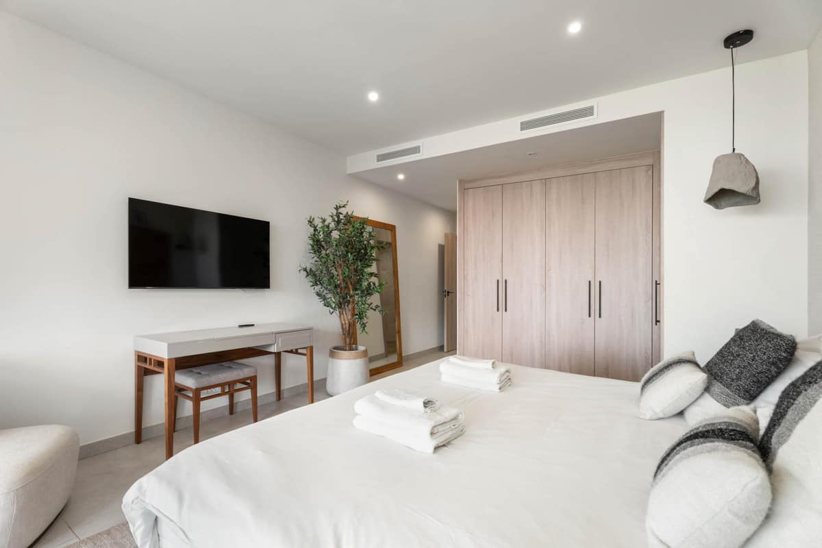 On this level, three bedrooms are arranged for comfort and privacy. The primary suite and one guest bedroom, both with en-suite bathrooms, are located in a private night area. The primary suite also features a dressing area and direct terrace access. A third guest bedroom with fitted wardrobes is complemented by a separate full bathroom.