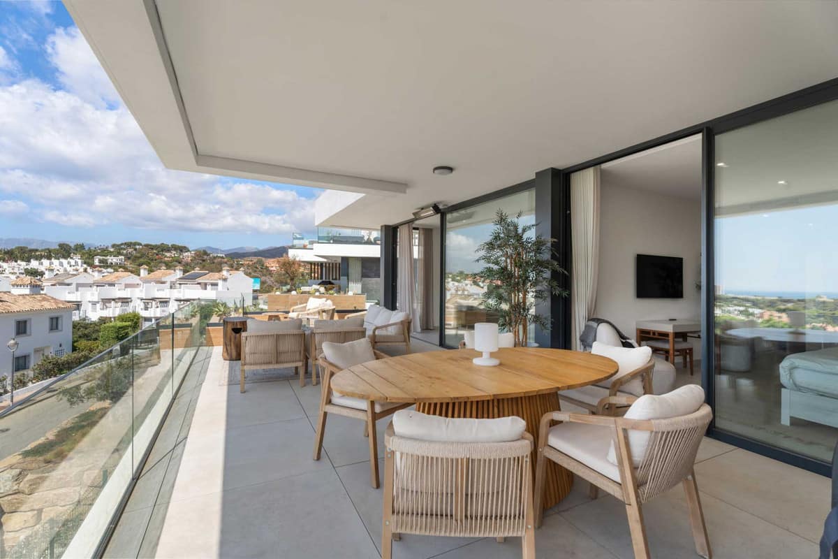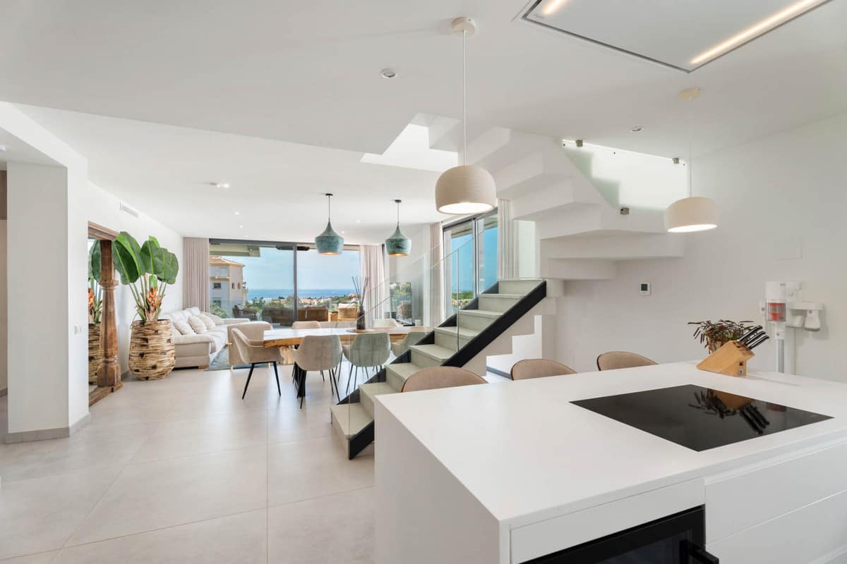 This contemporary duplex penthouse in Marbella East is thoughtfully designed across two levels, combining modern architecture with well-defined living spaces. Every detail has been considered to maximize natural light, seamless indoor-outdoor living, and privacy.
