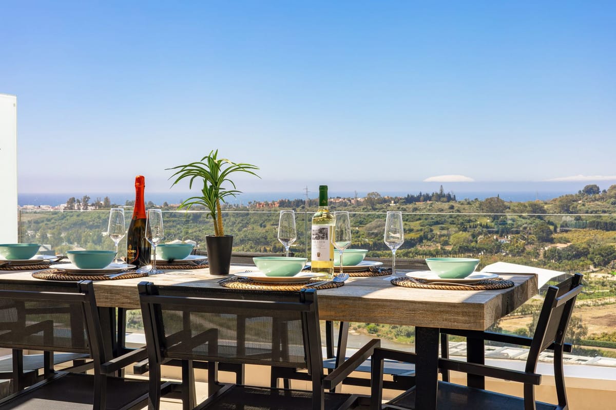 This elegant 3-bedroom, 2-bathroom residence, built in 2021, boasts uninterrupted panoramic views stretching from the glittering Mediterranean Sea to the dramatic Sierra Bermeja mountains.