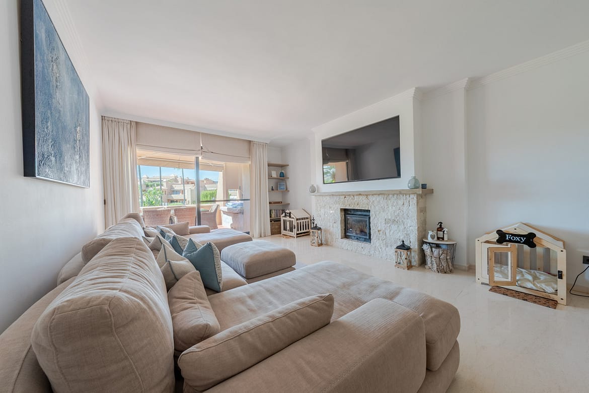 With polished marble floors, a modern kitchen, and a cozy fireplace, the open-plan living and dining area connects smoothly to a large, covered terrace — made for easy indoor-outdoor living