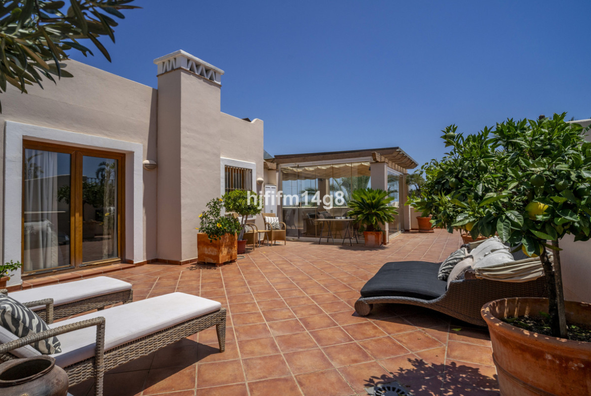 The highlight of this penthouse is the rooftop terrace, an extraordinary outdoor space that is truly one of a kind. The terrace is divided into distinct areas, offering a perfect balance of comfort and functionality. As you ascend to the rooftop, the first section on the left features lots of space for relaxation, from here you access a fully enclosed area with glass curtains, with a kitchen, dining area, and lounge area, all beautifully covered to offer comfort year-round. Continuing through this space, you’ll reach another charming section of the terrace with sun loungers, ideal for soaking up the sun. A few steps up from here leads to the private heated pool, where you can enjoy panoramic views while swimming in absolute privacy. The terraces are beautifully landscaped, featuring potted fruit trees and lush plants, creating an oasis of greenery and tranquility. A total space of 170m2 .