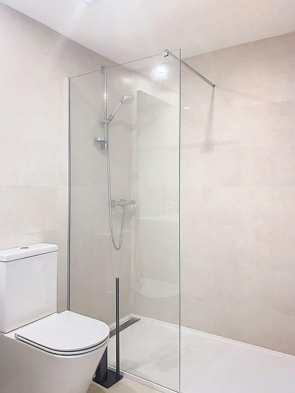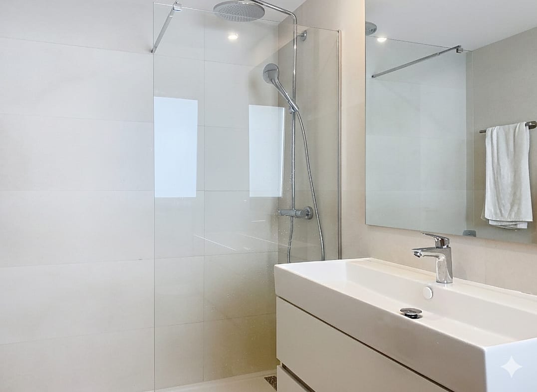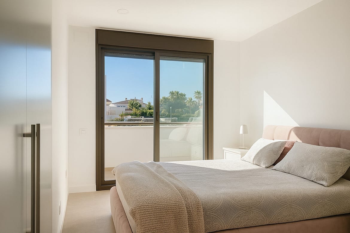 Accommodation comprises three well-proportioned bedrooms, each with fitted wardrobes and electric blinds for privacy and comfort. The master suite features an en-suite bathroom, and together with another bedroom has direct access to the second terrace of this floor. Both bathrooms are finished to an excellent standard, with quality fixtures and fittings. A modern staircase with a glass railing leads from the living room to a 90 m² solarium featuring open panoramic sea views, thoughtfully pre-installed for a jacuzzi and offering plenty of space to entertain guests or simply relax and enjoy the Mediterranean atmosphere.