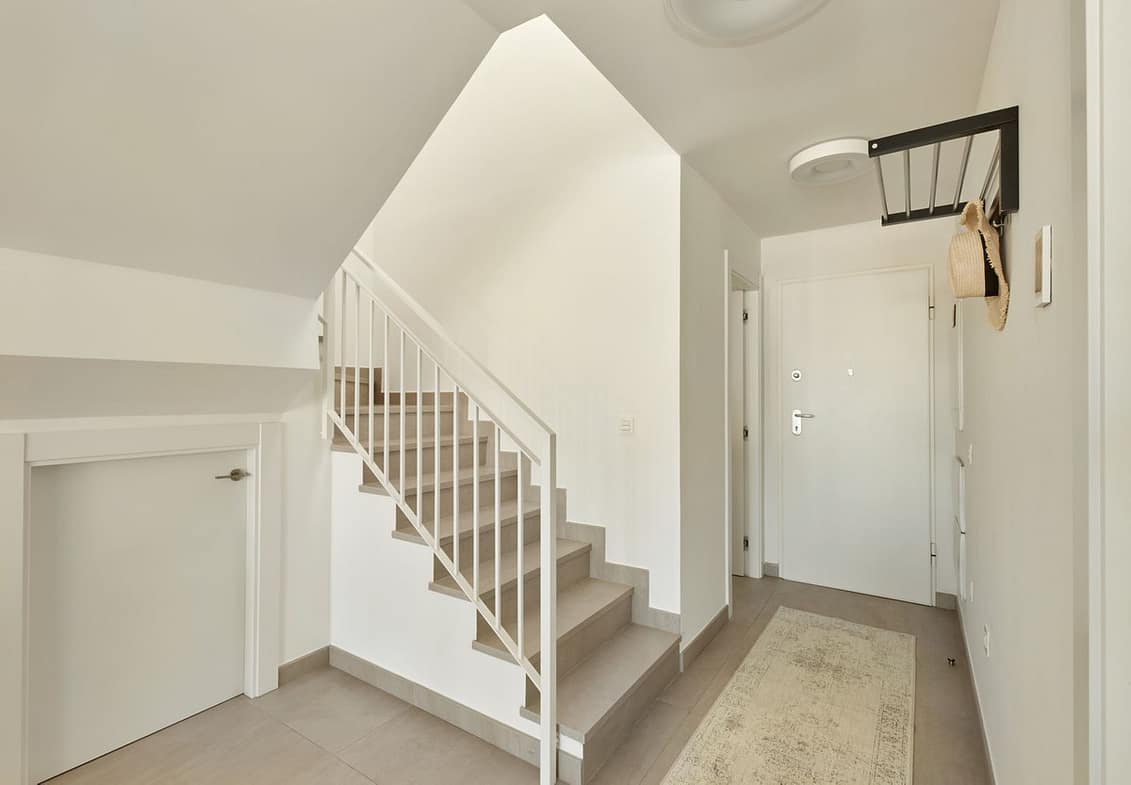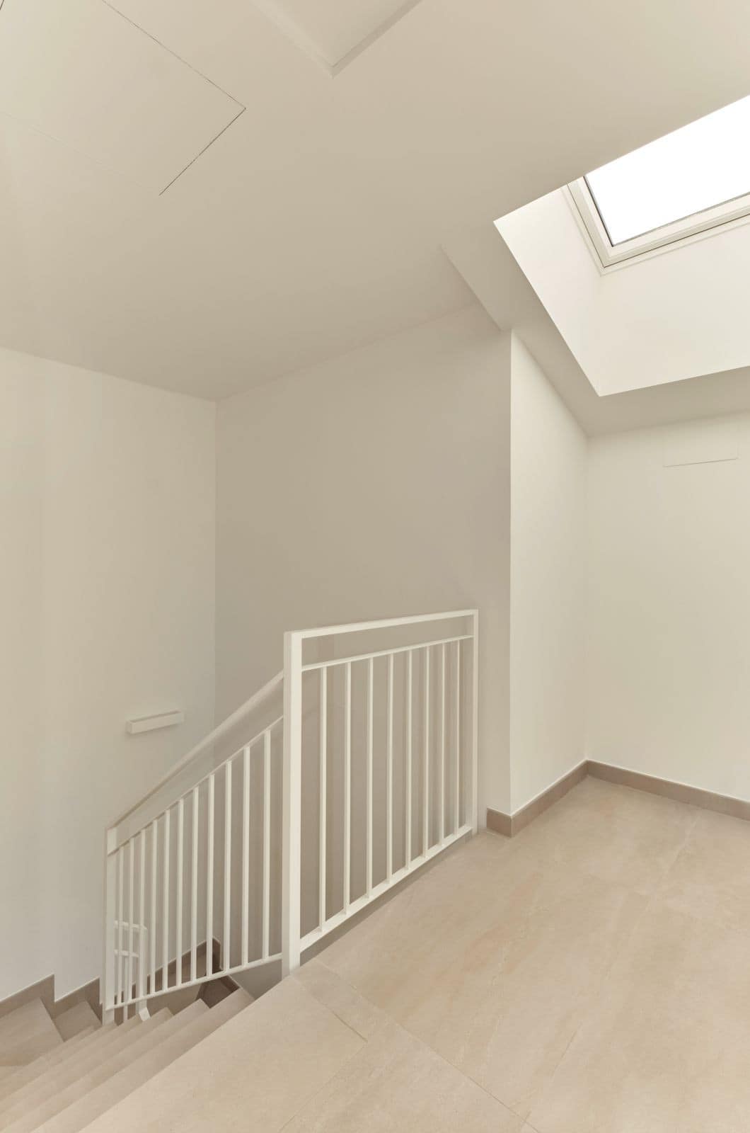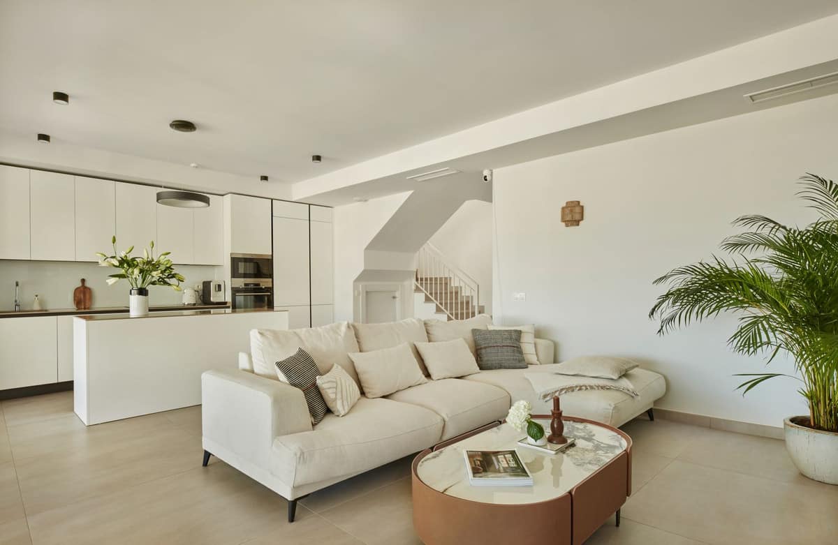 The duplex comprises three double bedrooms, including a master suite with a walk-in wardrobe and en-suite bathroom, three full bathrooms, a spacious open-concept living-dining room of more than 35 m² with a brand-new fully equipped kitchen, an independent laundry room, a private storage room, and an internal staircase.