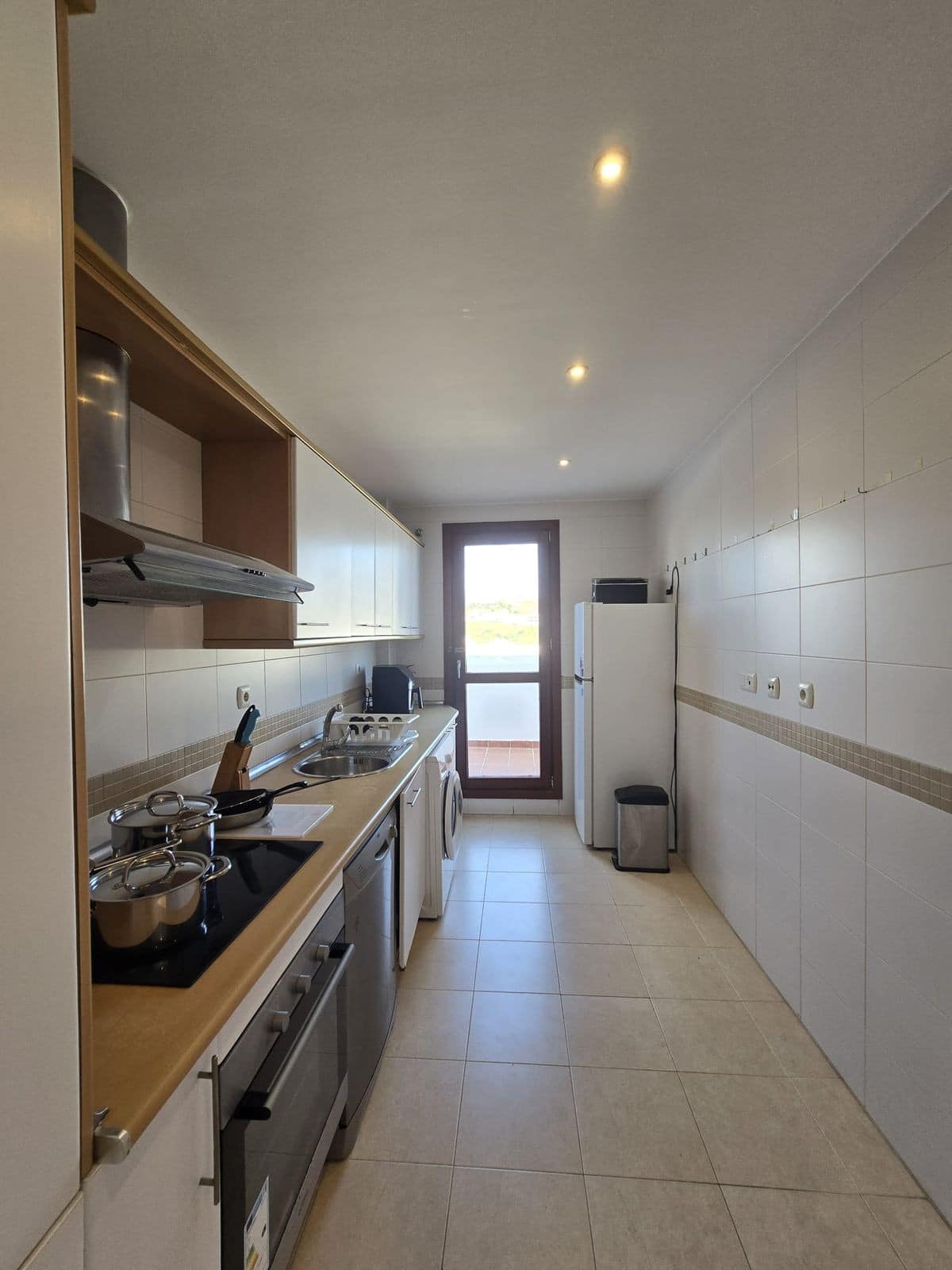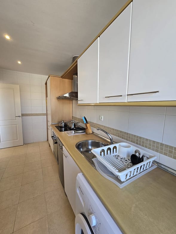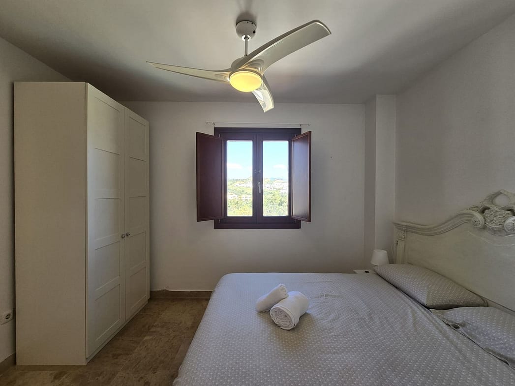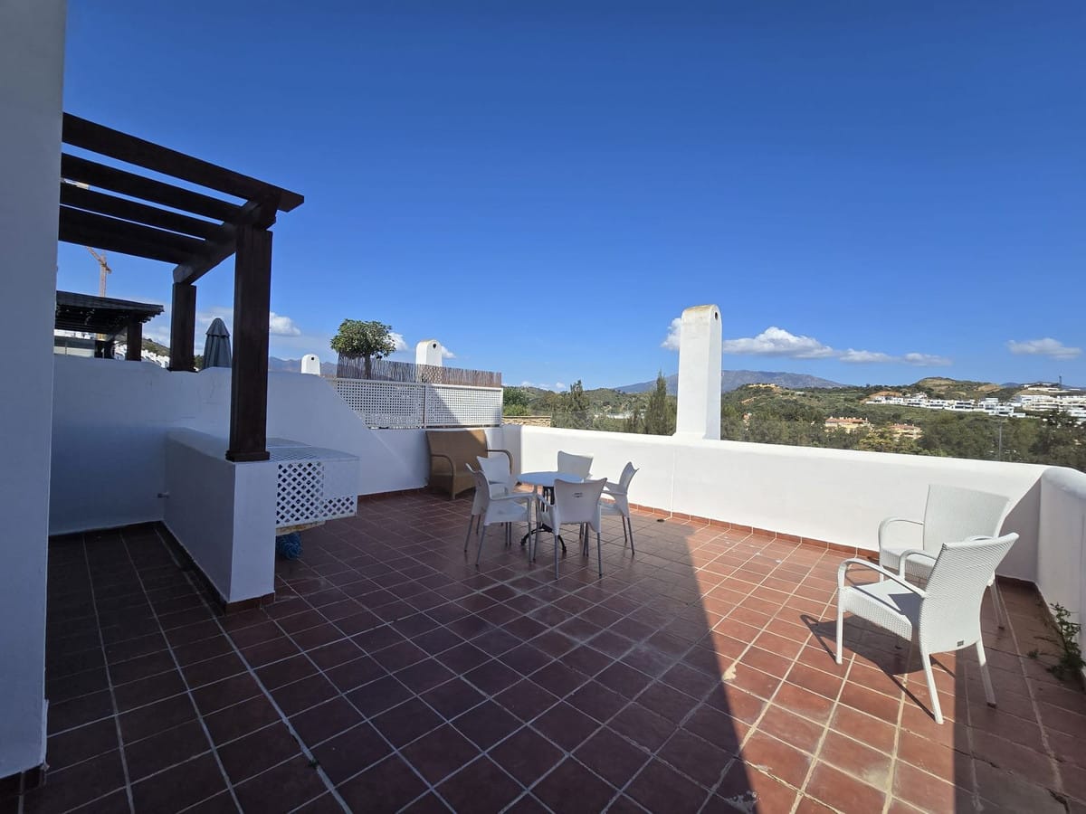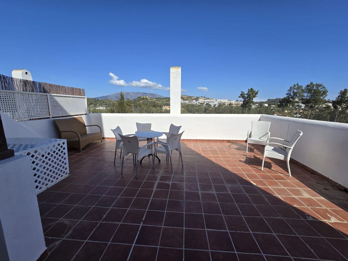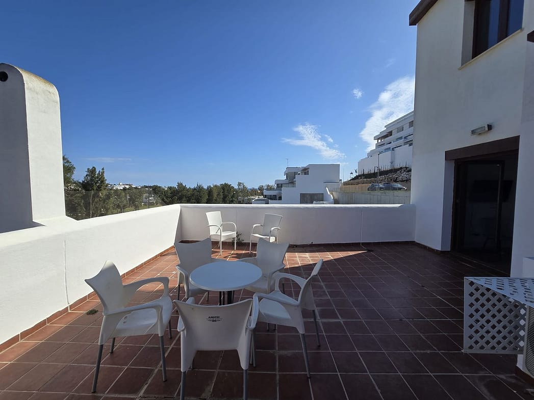 The first floor consists of 3 bedrooms and two complete bathrooms (one en-suite), all the bedrooms have fitted wardrobes. Then on the ground floor we find a guest toilet, kitchen and living room, both rooms with direct access to a large terrace overlooking the sea, mountains, golf and one of the swimming pools (there are 2) of the urbanization. Southeast facing.
