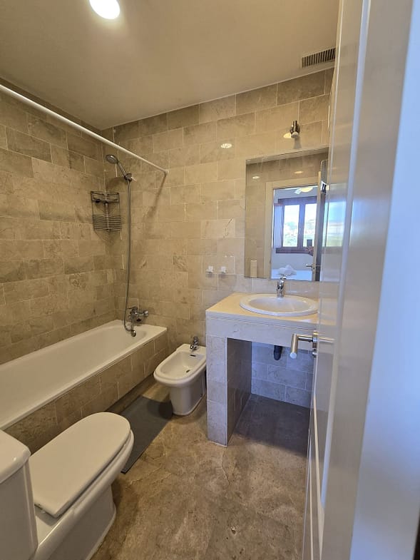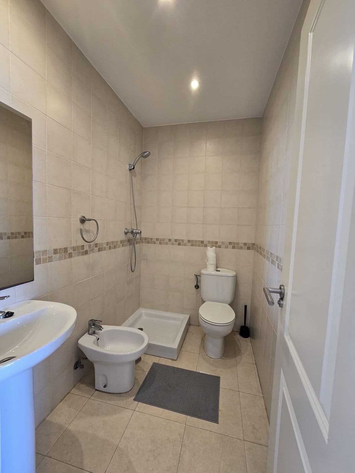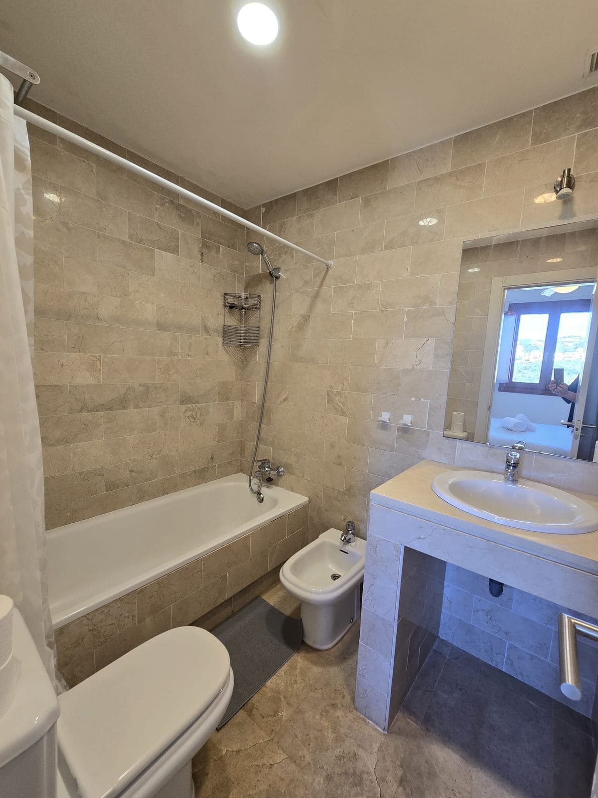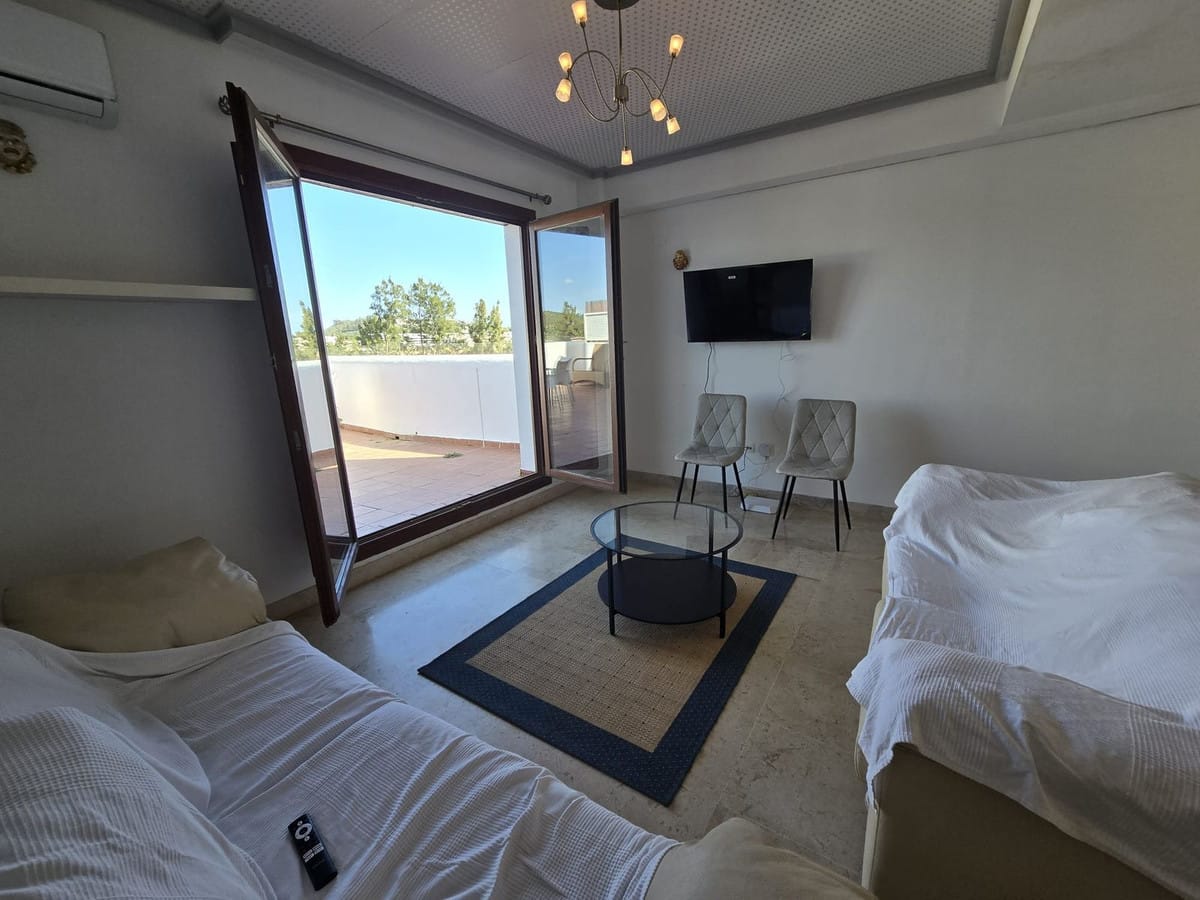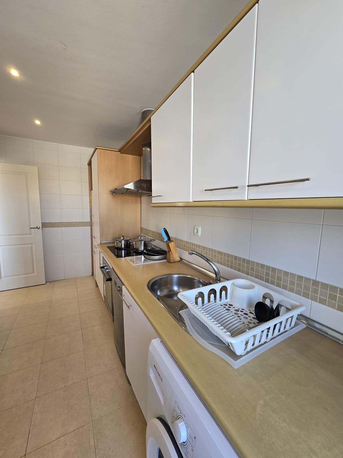 The first floor consists of 3 bedrooms and two complete bathrooms (one en-suite), all the bedrooms have fitted wardrobes. Then on the ground floor we find a guest toilet, kitchen and living room, both rooms with direct access to a large terrace overlooking the sea, mountains, golf and one of the swimming pools (there are 2) of the urbanization. Southeast facing.